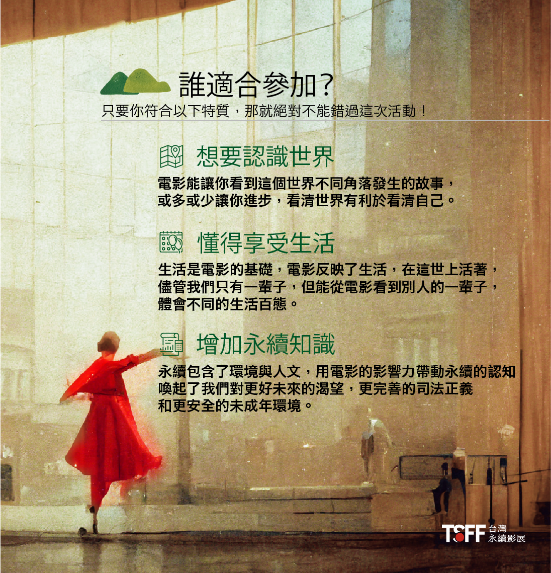 5.TSFF永續影展保有最終修改、變更、活動解釋及取消本活動之權利,若有相關異動將公告於官方粉絲團。