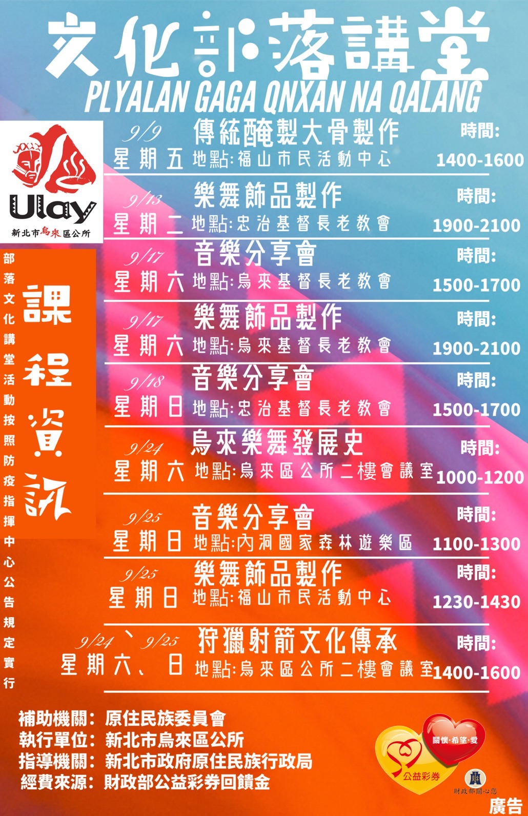 *此外,每參加一堂部落文化講堂的課程即可蓋章乙次,累積3個章以上者就可符合參加抽獎資格,抽中即可獲得烏來配合溫泉業者泡湯卷乙張*