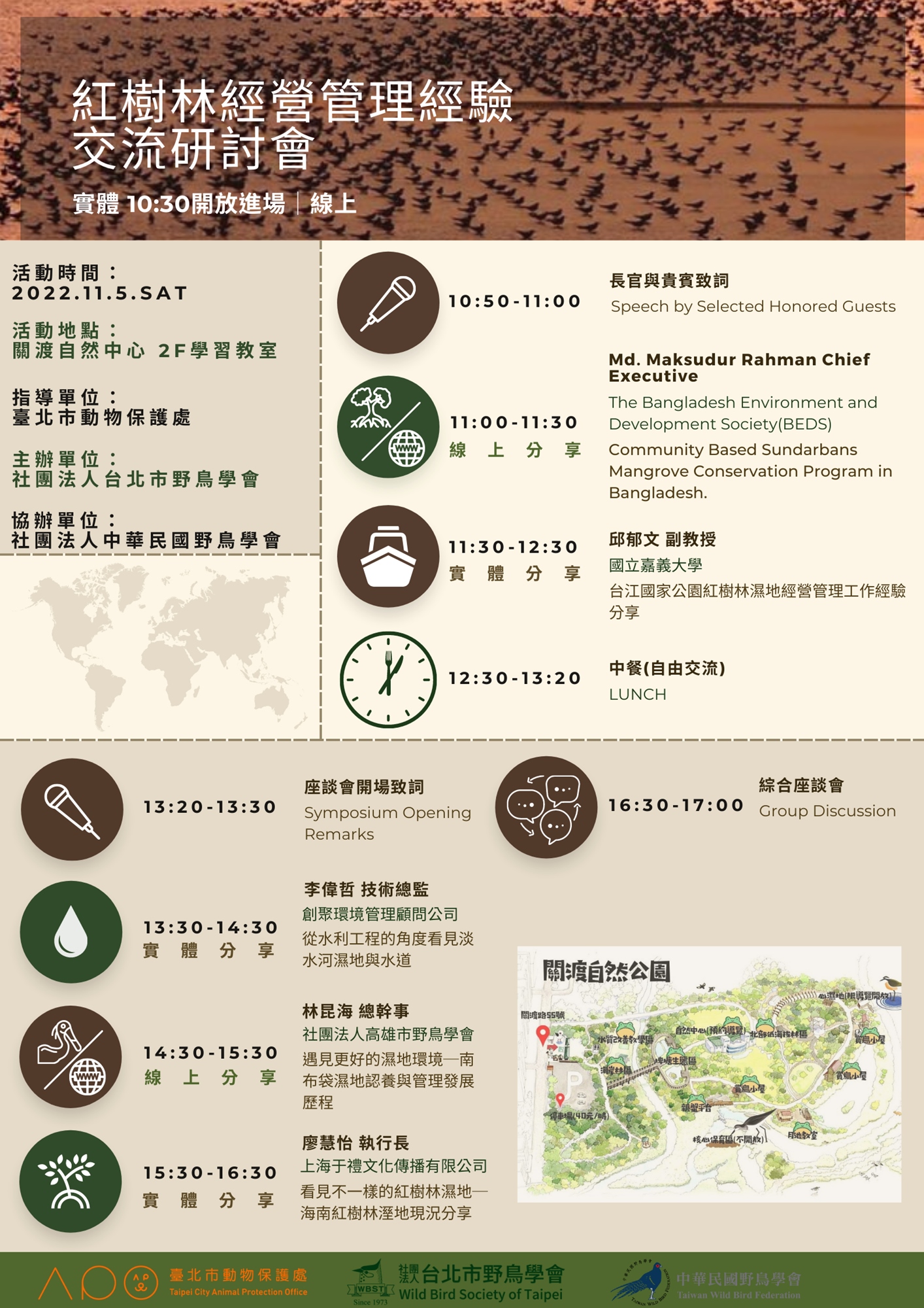 為達到保護水鳥及濕地棲地之目標及配合未來關渡防洪計畫,故辦理紅樹林經營管理經驗交流研討會,以改善整體環境。