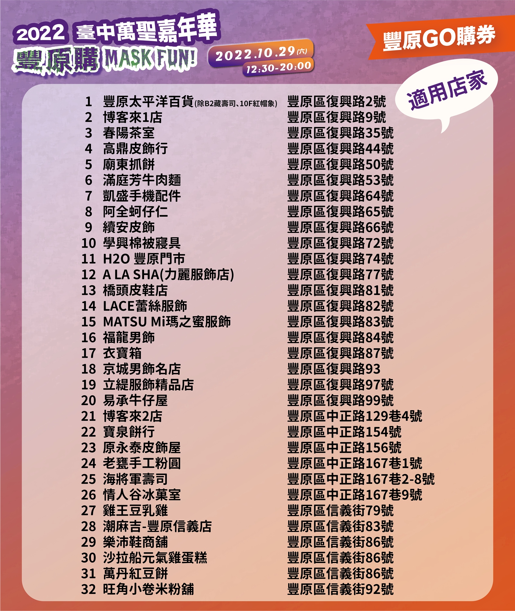 其中1聯可使用於豐原太平洋百貨(除B2藏壽司、10F紅帽象不適用)及豐原廟東復興商圈店家