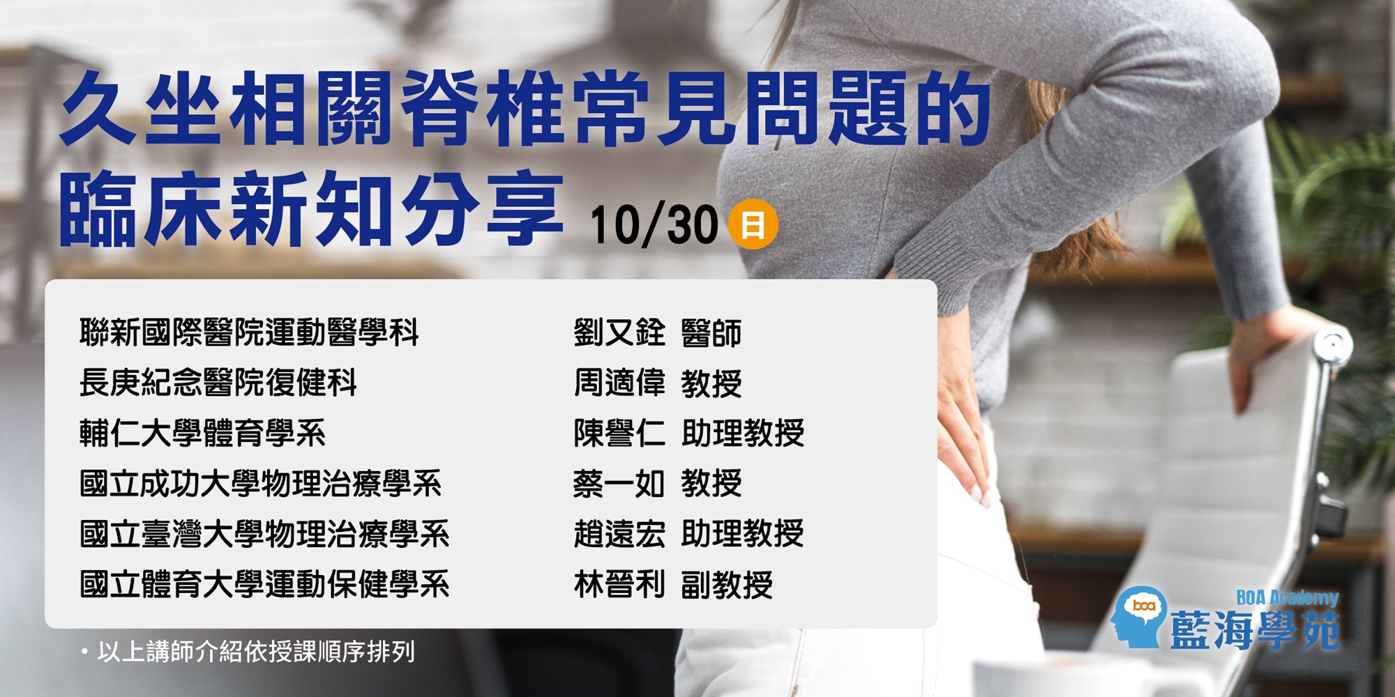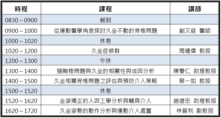 因此,本課程特地邀請長庚醫院復健科 周適偉教授針對『久坐症候群』帶來深入淺出的剖析與說明;此外,也同步『從運動醫學角度探討久坐不動的脊椎問題』,該主題由聯新國際醫院運動醫學科 劉又銓醫師進行分享,提供臨床工作者不同的思考脈絡;而面對久坐對脊椎結構帶來的改變,若能輔以實證醫學的分析支持,勢必能做出更適切的介入決策,故亦邀請了研究人體動作科學多年的成功大學物理治療學系 蔡一如教授,以及擅長運動生物力學的輔仁大學體育學系 陳譽仁助理教授,分別介紹『久坐相關脊椎問題之評估與預防介入策略』,及『頸胸椎問題與久坐的相關性與成因分析』等研究成果;選擇合適的輔具以及制訂完善的運動處方同樣是久坐族群需要關切的面向,專精於醫學工程的臺灣大學醫學院物理治療學系 趙遠宏助理教授以及熟稔運動指導設計的體育大學運動保健學系 林晉利副教授,將會從力學生物學和解剖動力學的角度出發,闡述『坐姿矯正的人因工學分析與輔具介入』與『久坐姿勢的動作分析與運動介入處置』等內容,涵括更多元的處置方針。