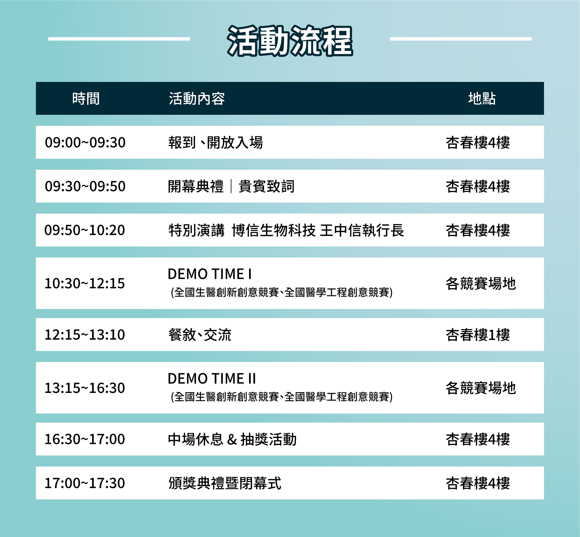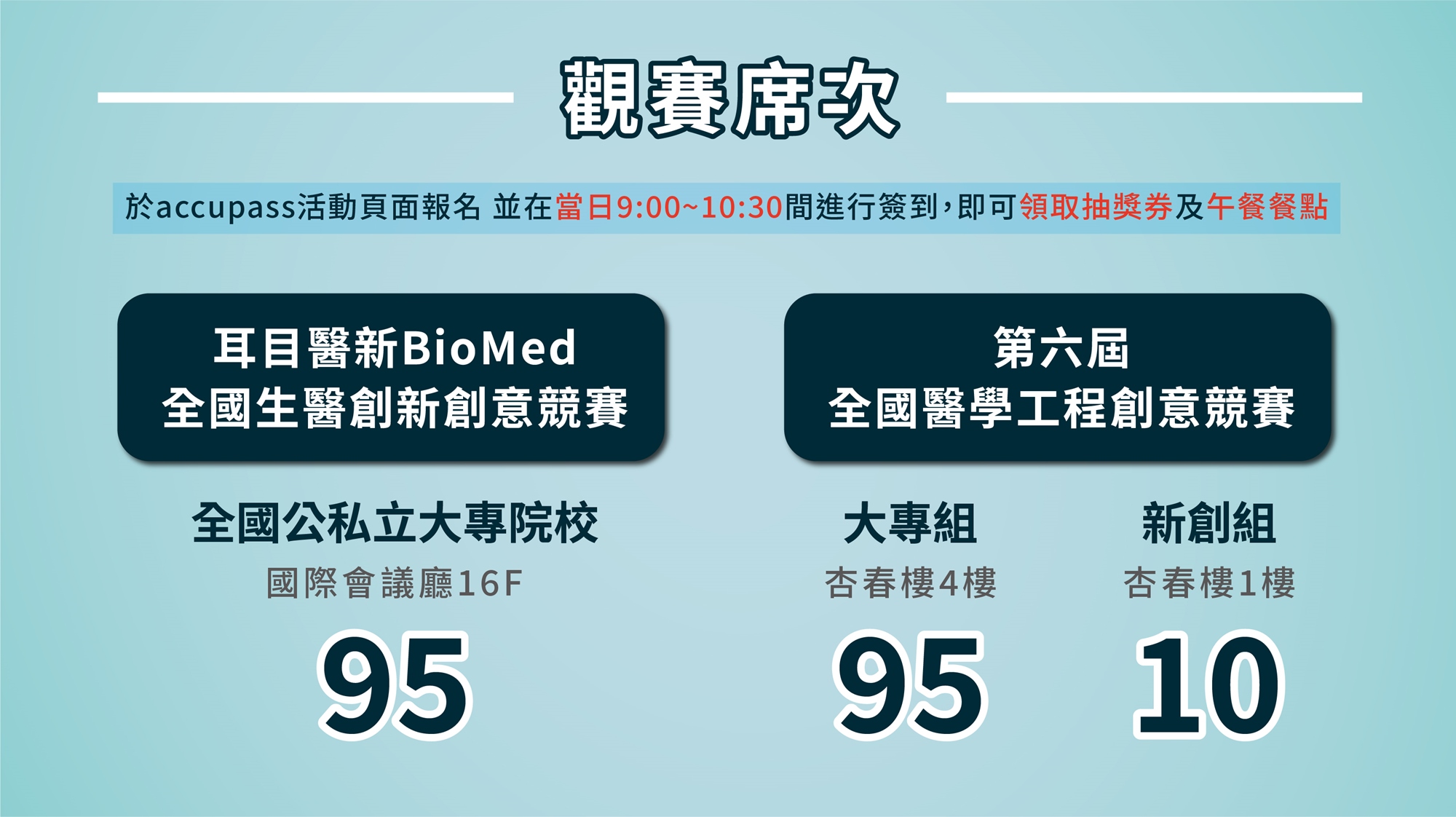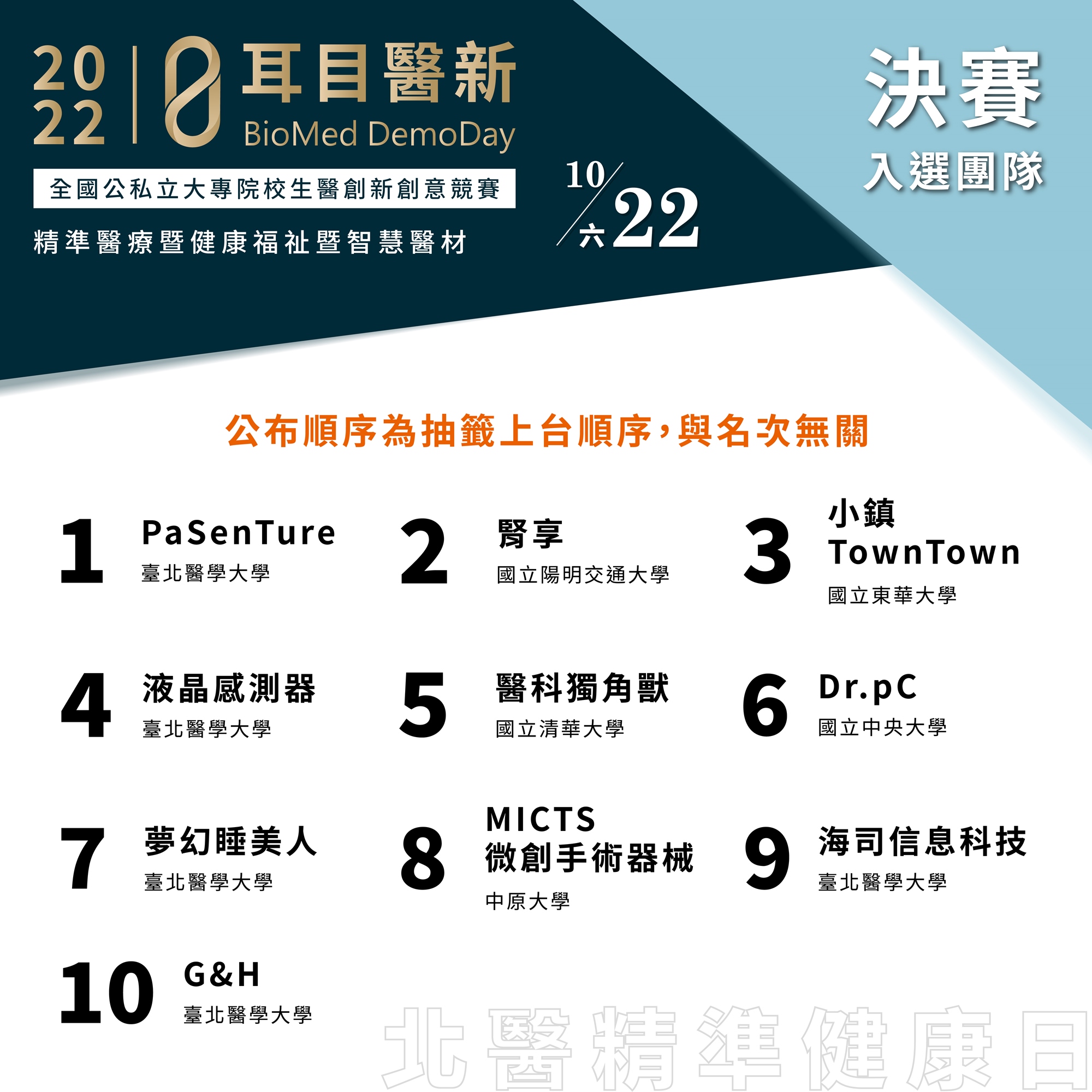 廣邀全國大專院校生醫領域的新創團隊,集結了來自北醫、陽明交大、清華、中央等學校的學生團隊報名參賽,同時也與政府計畫、生醫企業、醫學中心共同合作,給予台灣的學生生醫新創團隊最豐富的資源,以及最大的交流舞台。