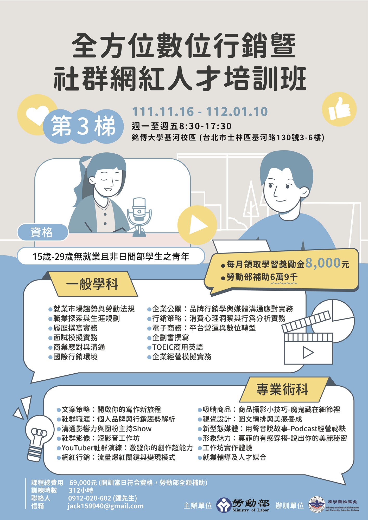 從社群行銷、文案創意、視覺設計、影音剪輯等四大技能開始,全方位實戰教學,將專業知識與實務操作緊密結合,掌握行銷企劃、內容創作、影音製播、電子商務的基礎。包含:社群行銷、品牌策略與管理、YouTube創作、Podcast聲音經濟、企劃撰寫、網路創業等領域。