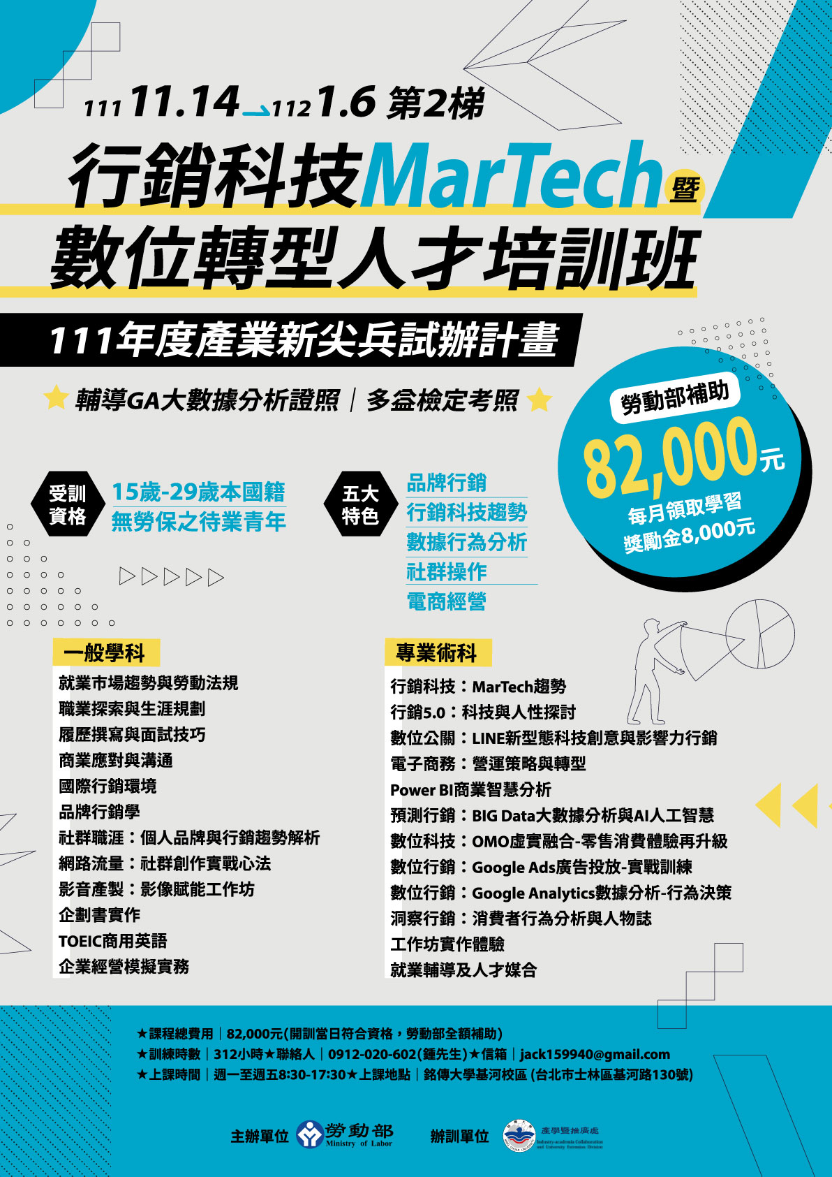 有鑑於此,本課程規劃理論及實務課程,目的在於訓練學員洞悉數位科技工具,以行銷科技 (MarTech) 六大領域,廣告技術、內容與體驗、社群關係、商業與銷售、數據,以及流程與管理切入;結合職涯前導課程,培養其兼具科技深度與知識廣度的核心能力,搶攻數位種子T型人才!