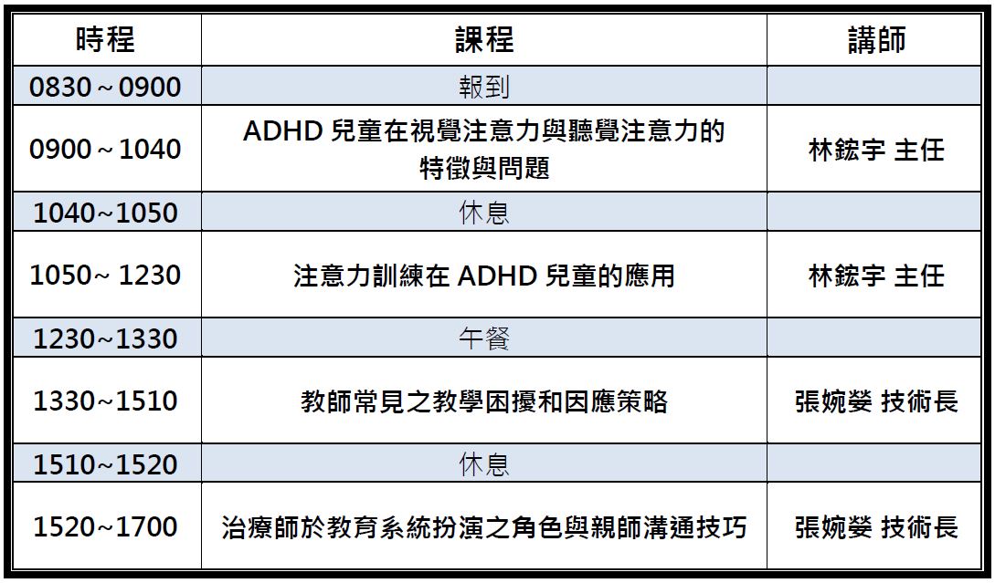 本課程特別邀請了亞洲大學職能治療學系 林鋐宇主任,分別針對「ADHD兒童視覺注意力與聽覺注意力的特徵與問題」及「注意力訓練在ADHD兒童的應用」進行介紹,使我們可以更清楚注意力不足過動症的孩子,在各類型注意力上的表現及介入的原則。