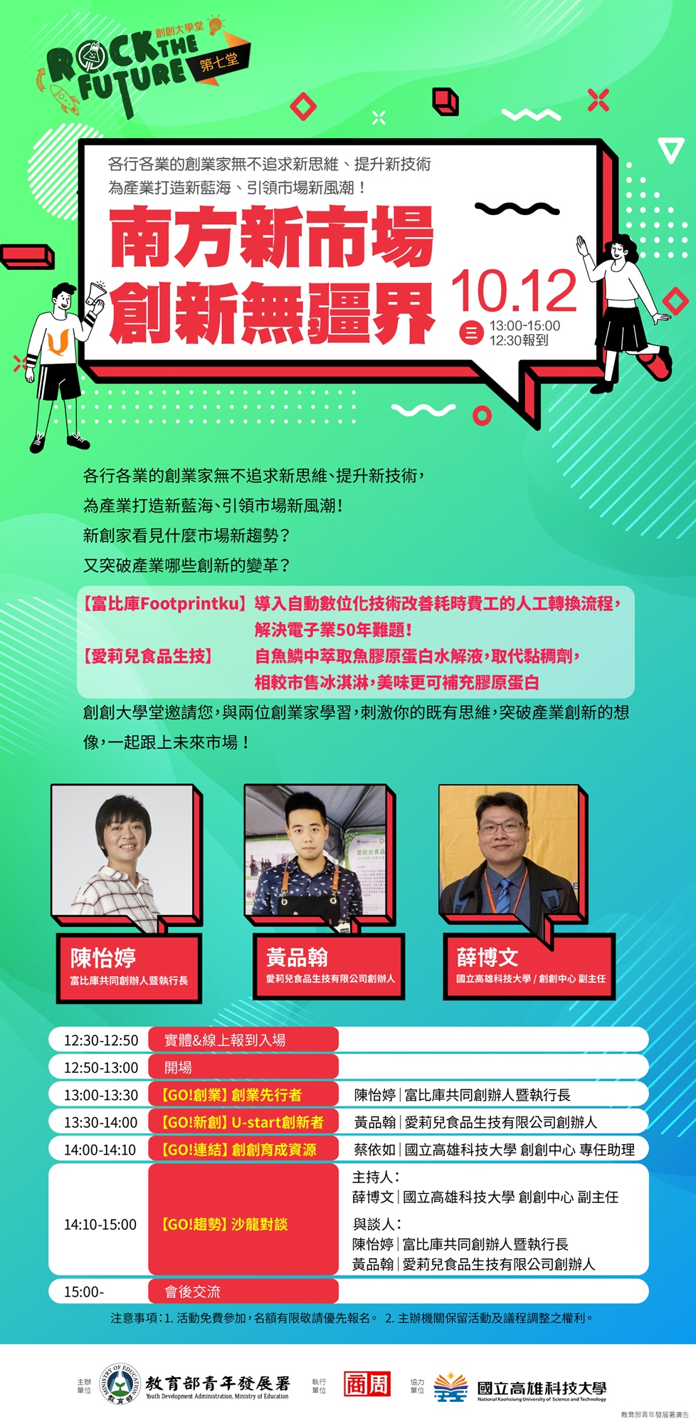 | 14:10-15:00 | 【GO!趨勢】未來市場沙龍對談 | 對談主持人 薛博文|國立高雄科技大學 創創中心 副主任 對談人 陳怡婷|富比庫共同創辦人暨執行長 黃品翰|愛 莉兒食品生技有限公司創辦人 |
