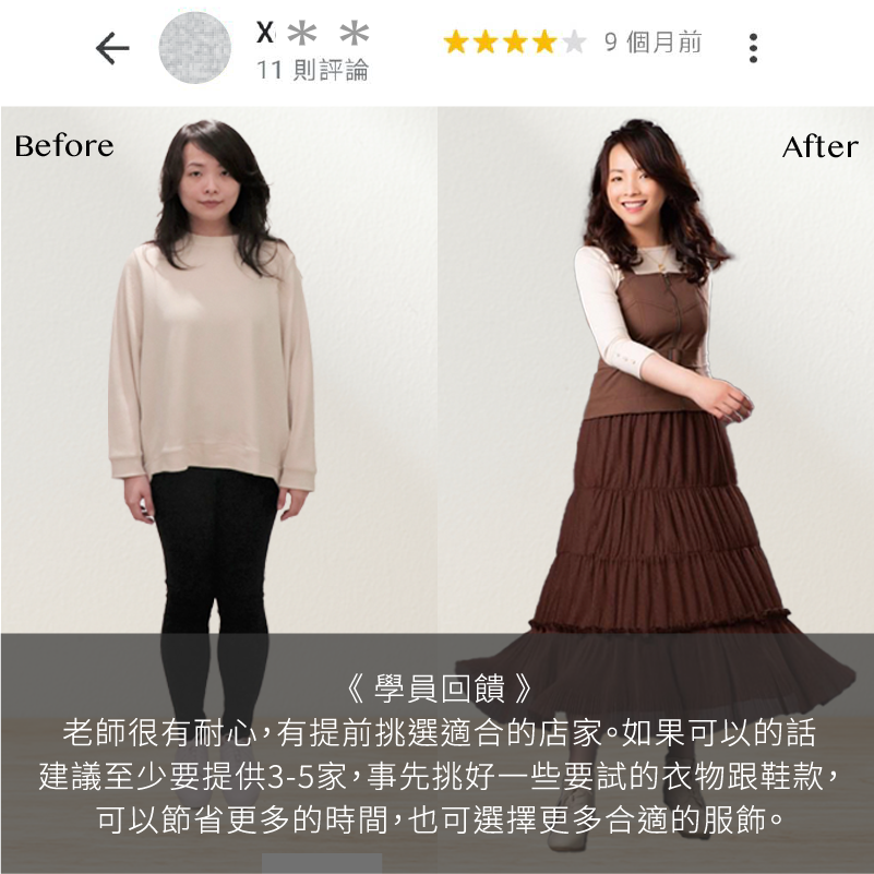 (課程會提供衣服搭配,也能以學員自己習慣的產品進行教學,指導。) - 當天上課會依照上課進度有可能會拉長課程時間,如果要安排穿搭課下課後的活動,請多預留半小時的空間。