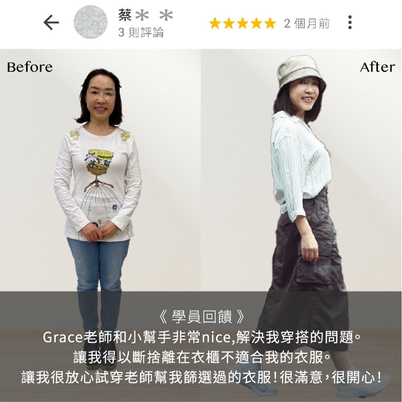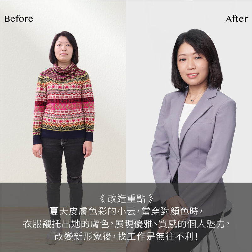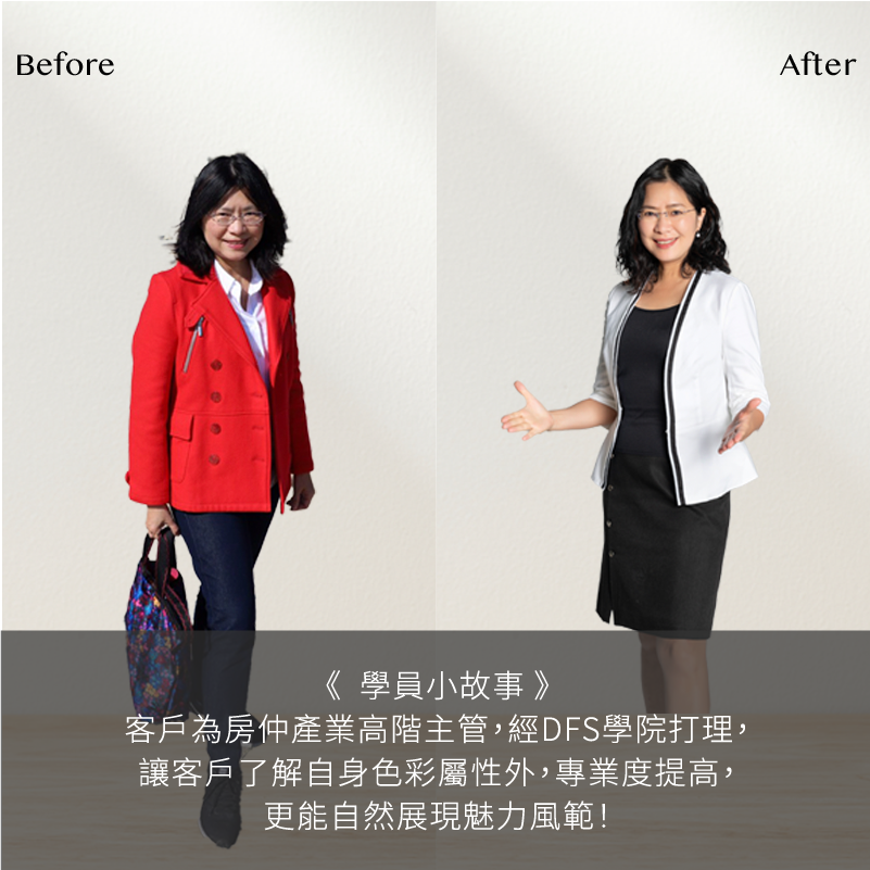 DFS形象顧問公司創辦人Grace,因認識形象管理後, 改變了一生, 看到全新的自己, 並體驗外在形象影響內在心理的正向循環的神奇力量,透過形象課程讓我們重新看到自己的優勢及潛力, 對自己更有信心。