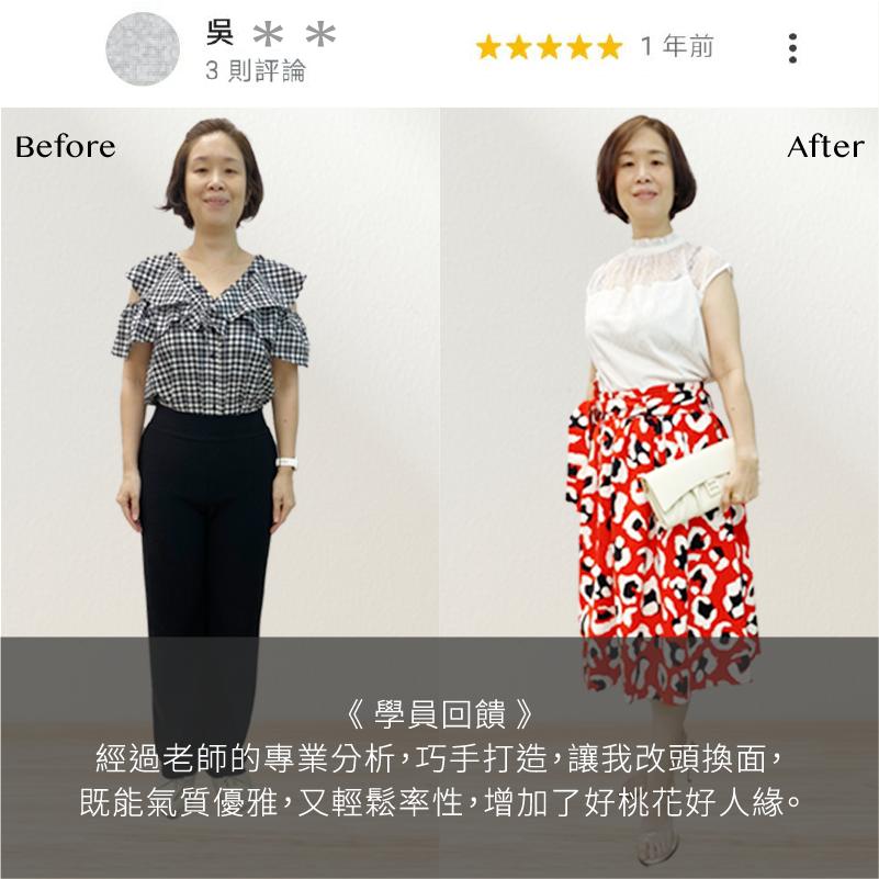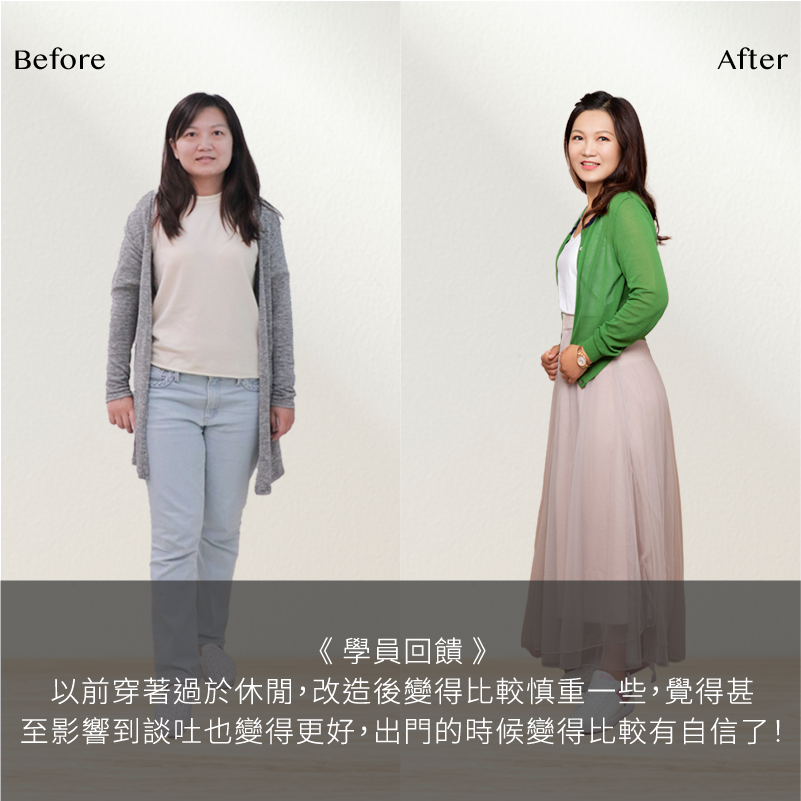 透過課程,老師將依學員「身材比例、皮膚色彩屬性、人格特質」展現最能凸顯個人優勢的穿搭