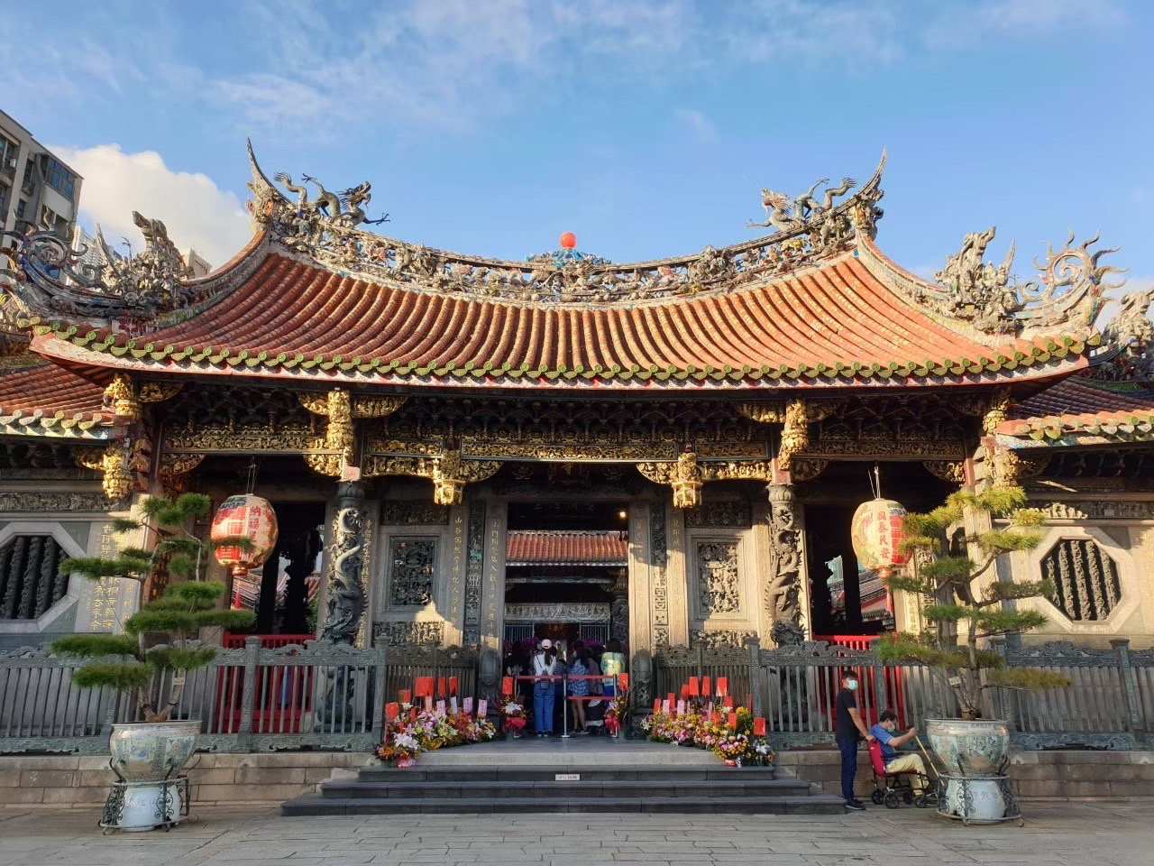 【龍山寺】與艋舺清水巖、大龍峒保安宮合稱為臺北三大廟門的龍山寺,不只是當地民眾的信仰中心,也是傳統匠藝的藝術殿堂,前殿的特色有八角藻井及全臺唯一的鑄銅龍柱,大殿有金柱撐起的圓形螺旋狀藻井,相當罕見。整體建築包括石雕、木雕、彩繪和格局樣貌均非常精緻,除展現傳統寺廟之美,並深具藝術價值,兩側護室上臺灣首次出現的轎頂式重簷屋頂鐘鼓樓,不僅美輪美奐,更影響後來各地廟宇的建築風格。