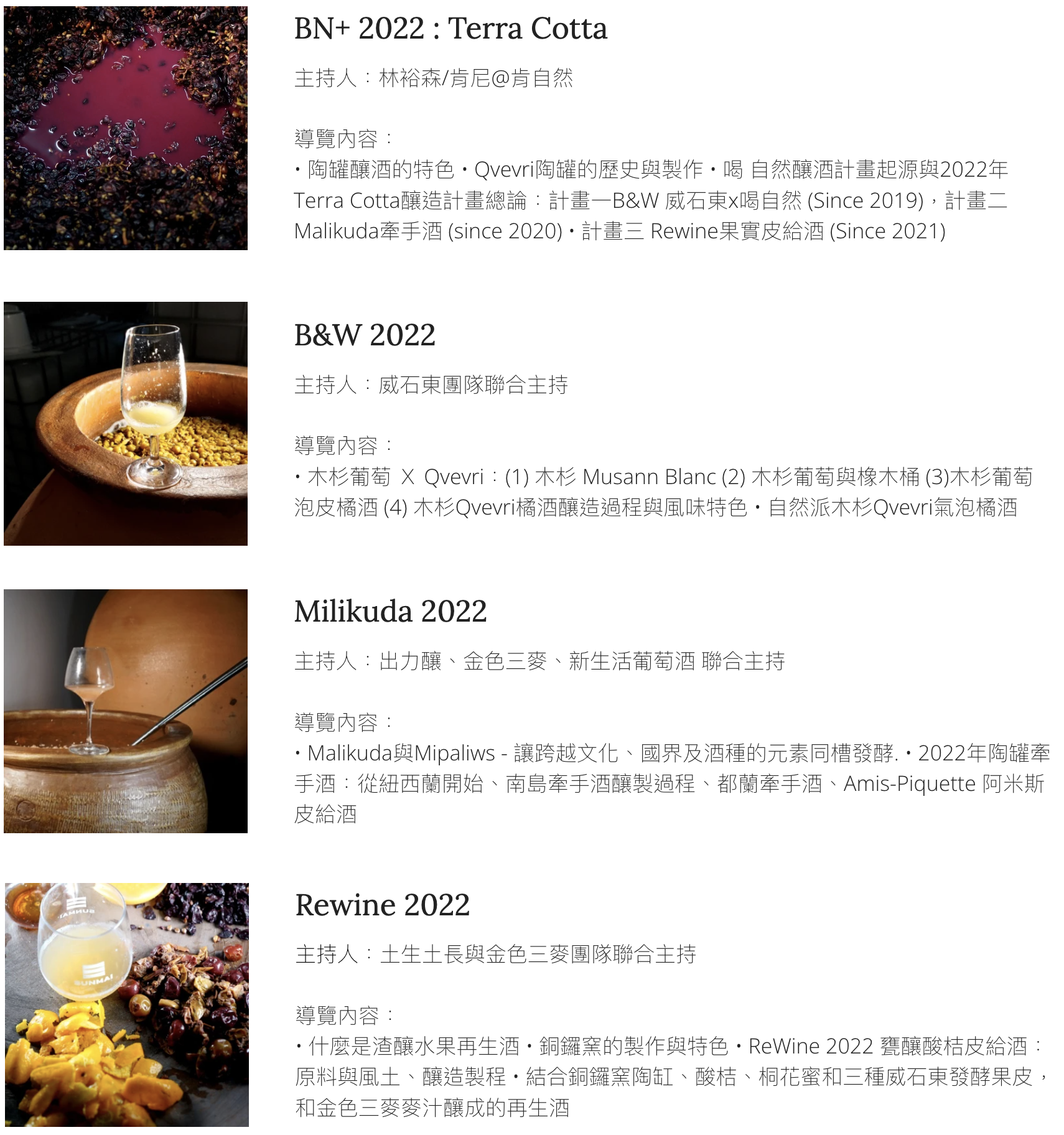 2022年喝 自然 釀酒實驗計畫以《土與火共舞Terra Cotta》 為主題,嘗試用喬治亞的Qvevri陶罐和苗栗銅鑼窯的陶缸來釀造台灣葡萄酒和混釀酒,以了解陶罐對風味的影響。 包括B&W、Malikuda和Rewine三個BN+計畫各釀造了不同釀酒容器的對照組,將與喝 自然葡萄酒展並行舉辦,以小組桶邊試飲的形式,體驗陶甕釀酒的歷程與成果。