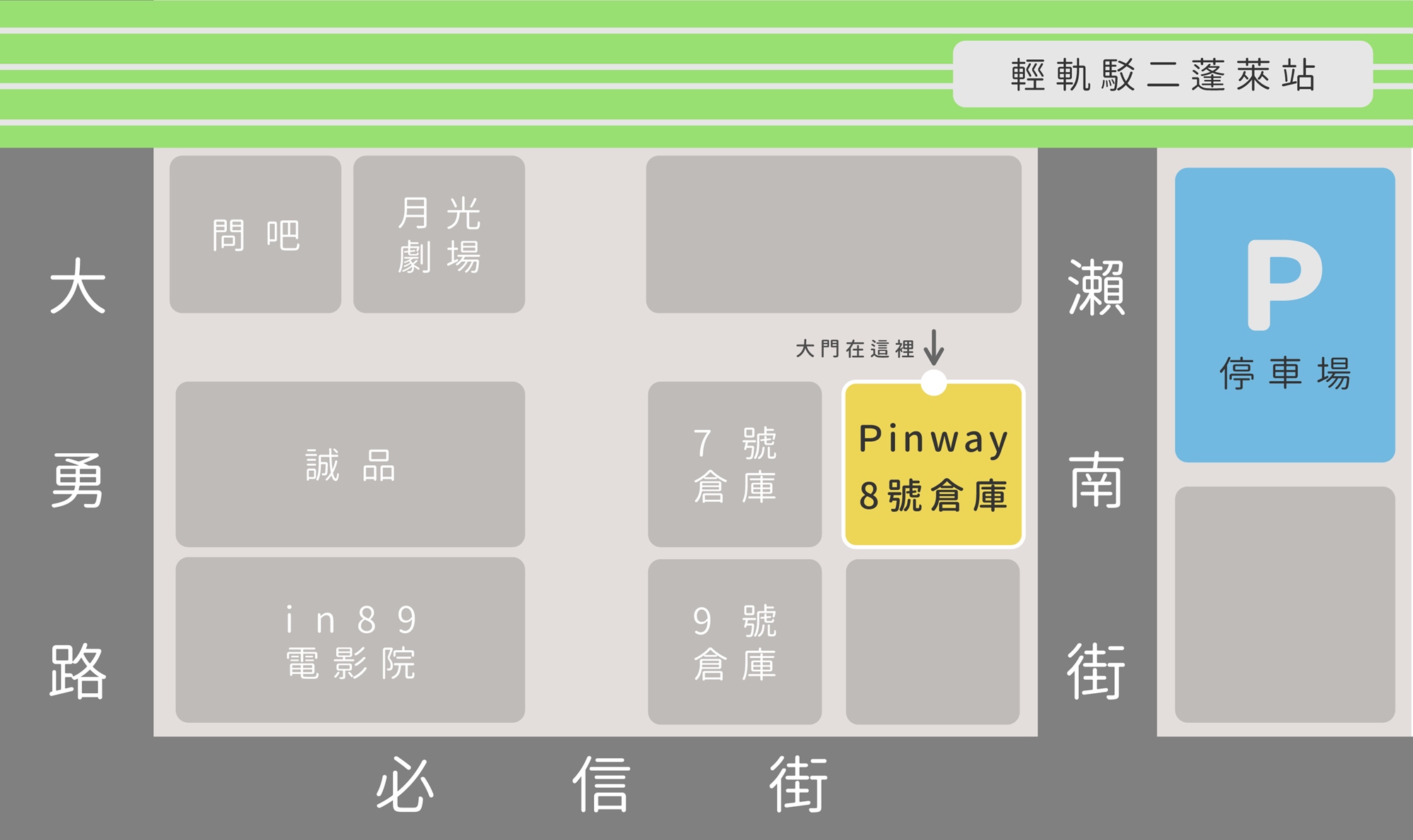 * 地點:高雄市鹽埕區瀨南街8號2F(駁二8號倉庫 Pinway)