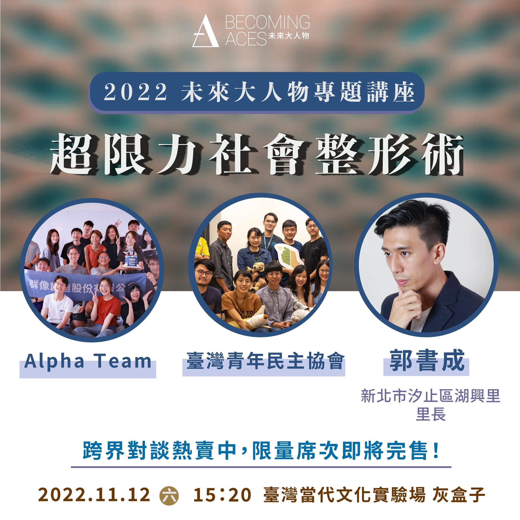 | 15:20-16:20 | 超限力社會整形術 Alphateam x 臺灣青年民主協會 x 新北市汐止區湖興里里長 郭書成 |