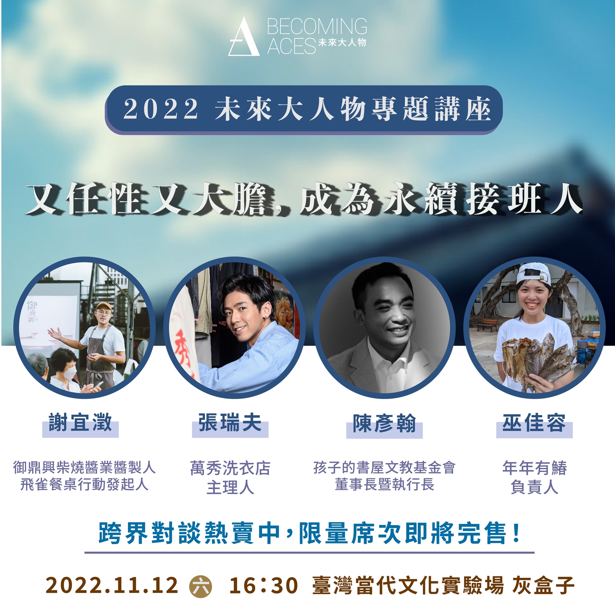 | 16:30-17:30 | 又任性又大膽,成為永續接班人 飛雀餐桌行動 謝宜澂 x 萬秀洗衣店 張瑞夫 x 孩子的書屋 陳彥翰 x 年年有鰆 巫佳容 |