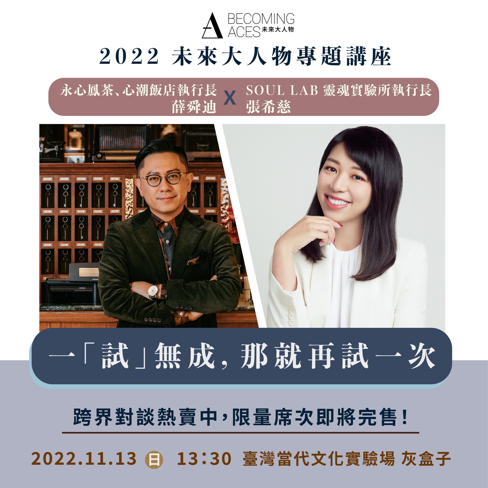 | 13:30-14:30 | 一「試」無成,那就再試一次 永心鳳茶、心潮飯店執行長 薛舜迪 x SOUL LAB 靈魂實驗所執行長 張希慈 |