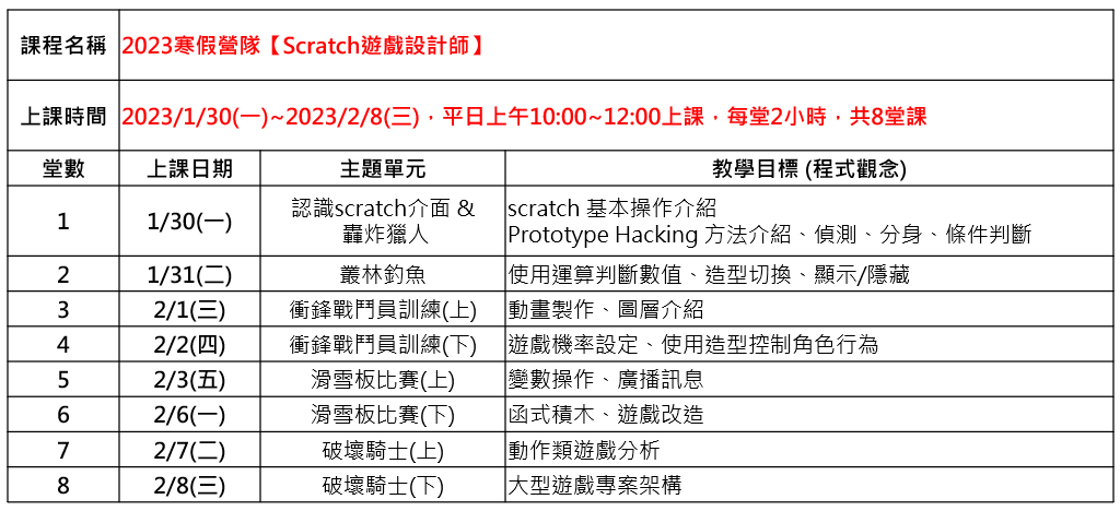 ●此班級固定:2023/1/30(一)~2023/2/8(三),平日上午10:00~12:00上課,每堂2小時,共8堂課。