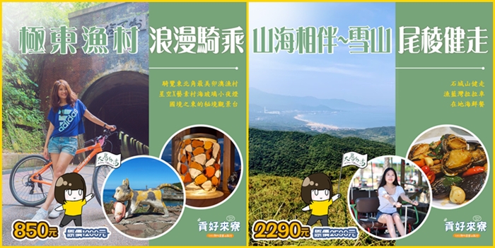 新北市貢寮擁有全台灣最美的海岸風景,騎上自行車從福隆車站出發,經過卯澳漁村秘境,抵達極東之境三貂角,近距離欣賞台灣最東的純白色燈塔,在極東觀景台一覽東北角最美麗的海岸風景,再到星空X藝素村,結合手作DIY、環保理念與藝術文化,是感受慢活節奏的好去處。