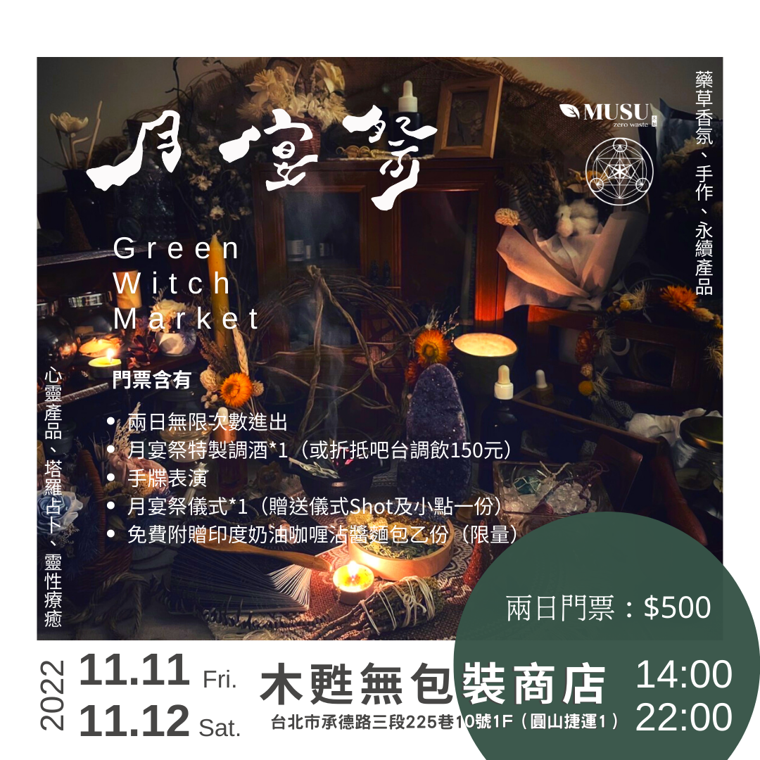 #月宴祭 #靈性療癒 #塔羅占卜 #藥草香氛 #室內市集 #永續 #Musu木甦 #圓山捷運站 #無包裝商店 #Taipei #台北 #環境無害 #花博 #sustainable #lessismore #ecofriendly #noplastics #環保 #圓山木甦 #活動 #11月