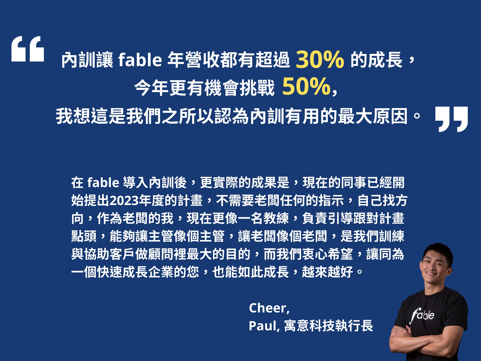 fable 成立於 2012 年,為新型態 IT 顧問公司。fable 透過培訓顧問以及 PM 為主要理念,運用外包技術資源,主導各種數位開發案的進行。過去十年,合作客戶遍佈全球 11 國,包含金融、零售、製造、藝術等產業,至今約有 100 個開發案經驗,合作的工程師與技術團隊超過 200 位。2013 年導入顧問協助轉型,從外增加公司服務項目至內組織成員升級,達到年營收逐年翻倍的成績。2021 年除了持續主導數位產品開發案外,更踏入企業內訓以及顧問服務,從商業角度到技術產品的開發,協助企業進行數位升級。
