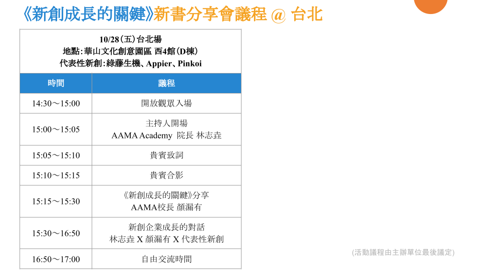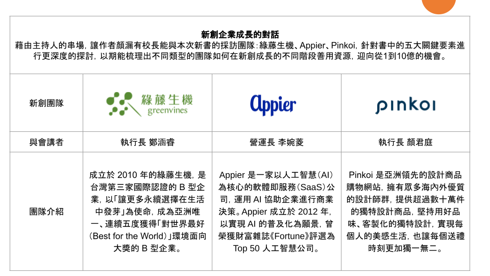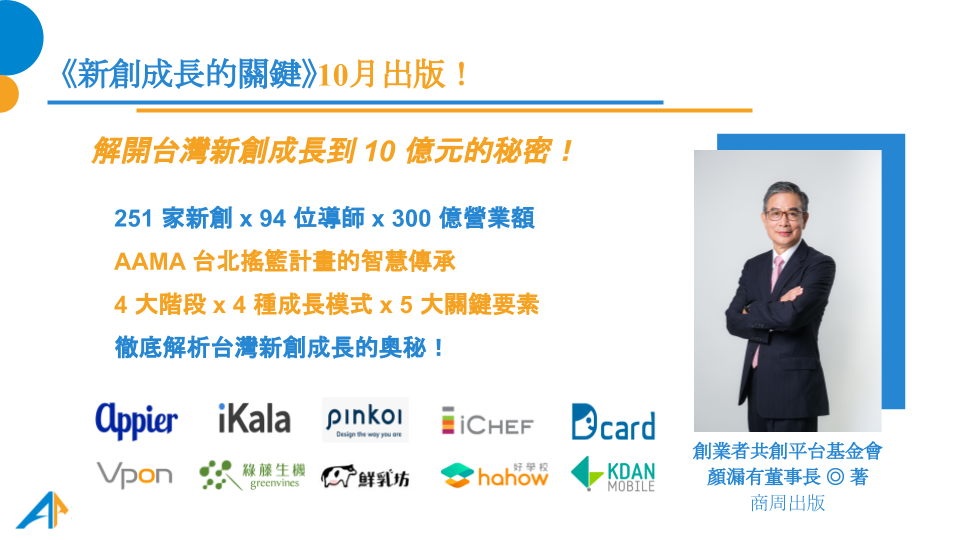 透過新書分享會的辦理,持續傳遞AAMA多年來對於新創團隊的理念:「成功不可複製、智慧可以傳承」。並與不同領域創辦人的對話與交流,讓更多創業者在組織成長過程中能擷取寶貴經驗,豐富國內創新創業生態圈、共生共榮。