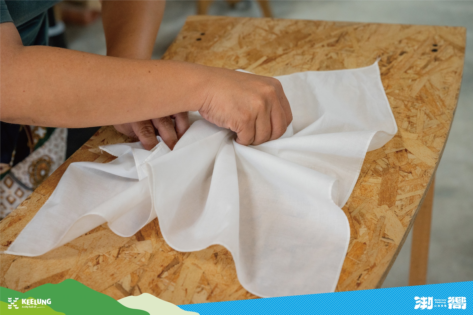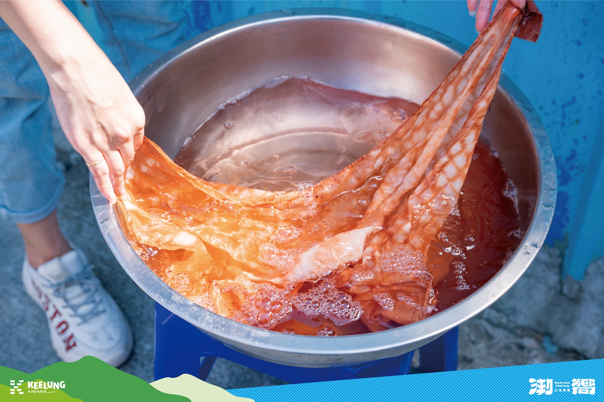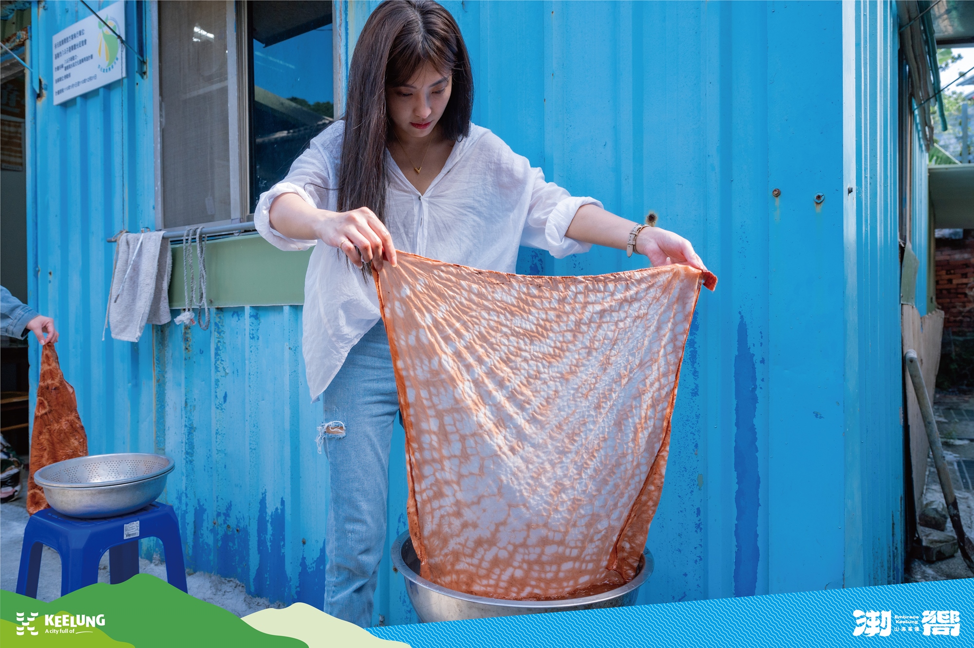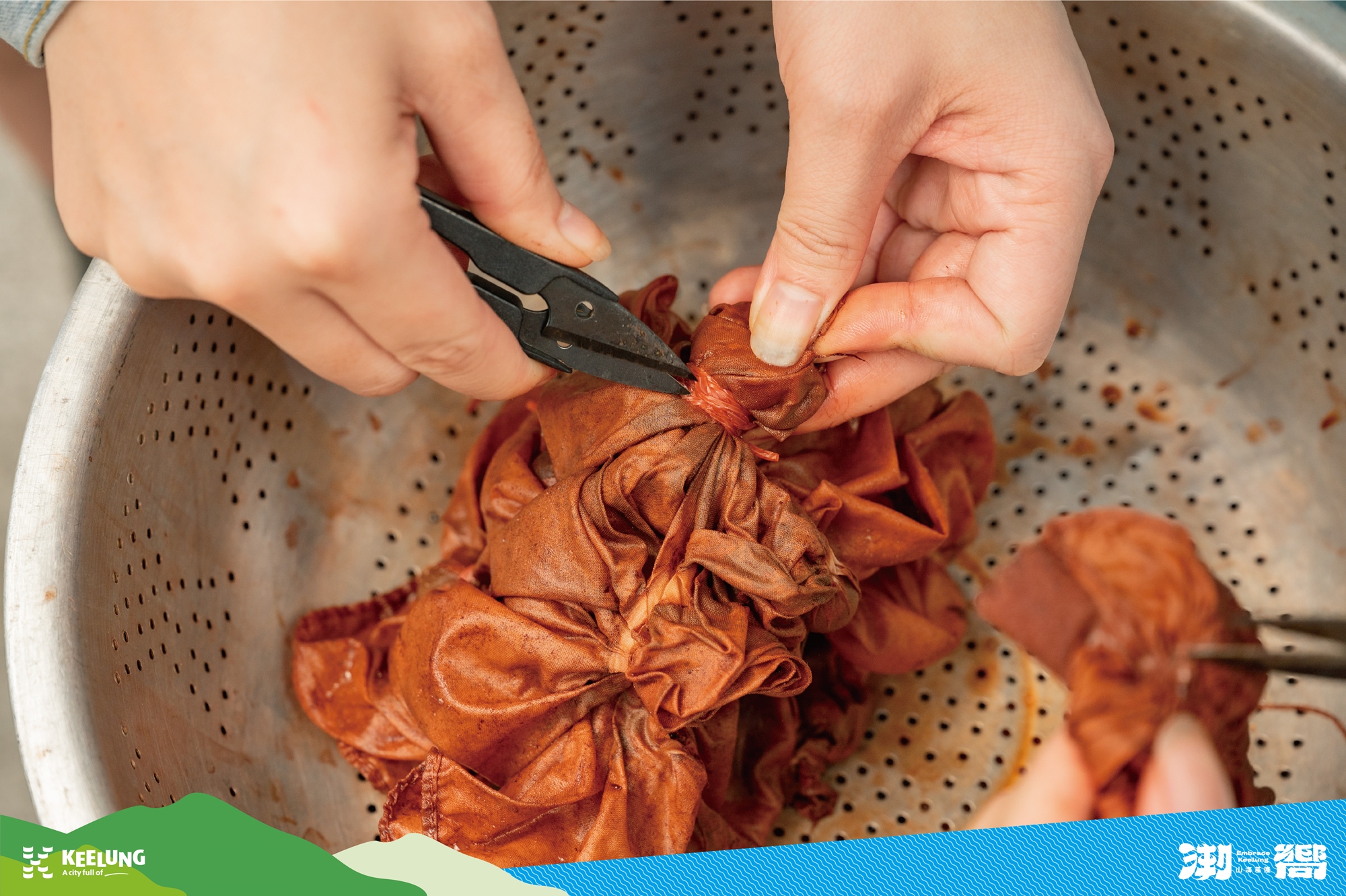 改以尼龍漁網捕魚的現在,這項漁村的傳統技藝轉為染布體驗,透過老師的教學,以折布、打結及纏布的技法,加入薯榔汁液煮沸上色後,就可以漂洗出屬於自己獨一無二的薯榔染布作品囉!