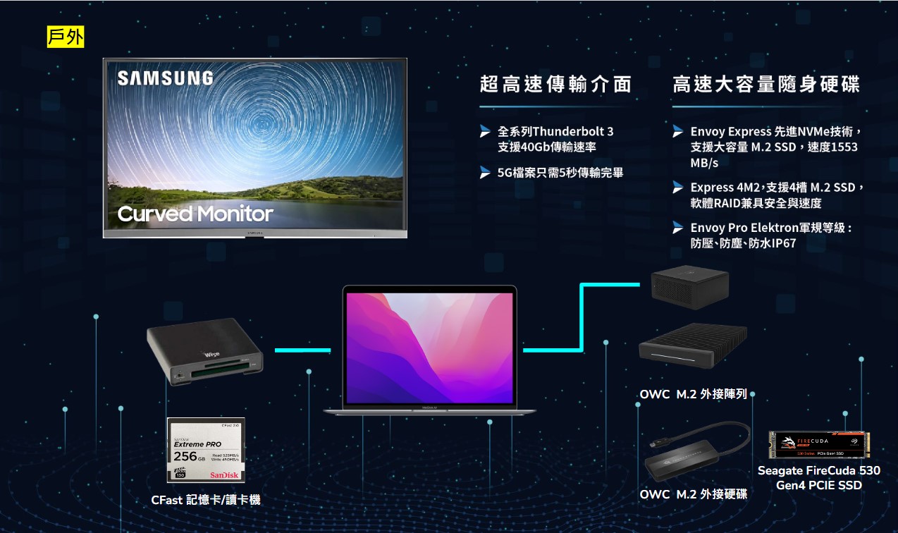 👉拍攝現場從攝影機的記憶卡到快速的固態硬碟與安全且快速的陣列硬碟。這部分會帶您認識讀卡機、固態硬碟與可攜的陣列硬碟,另外在沒電的環境中改如何應變。