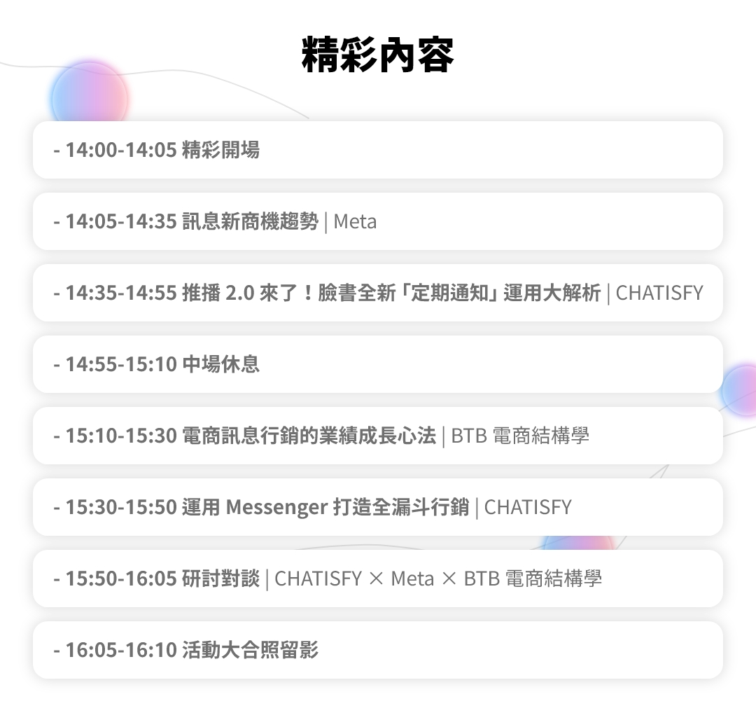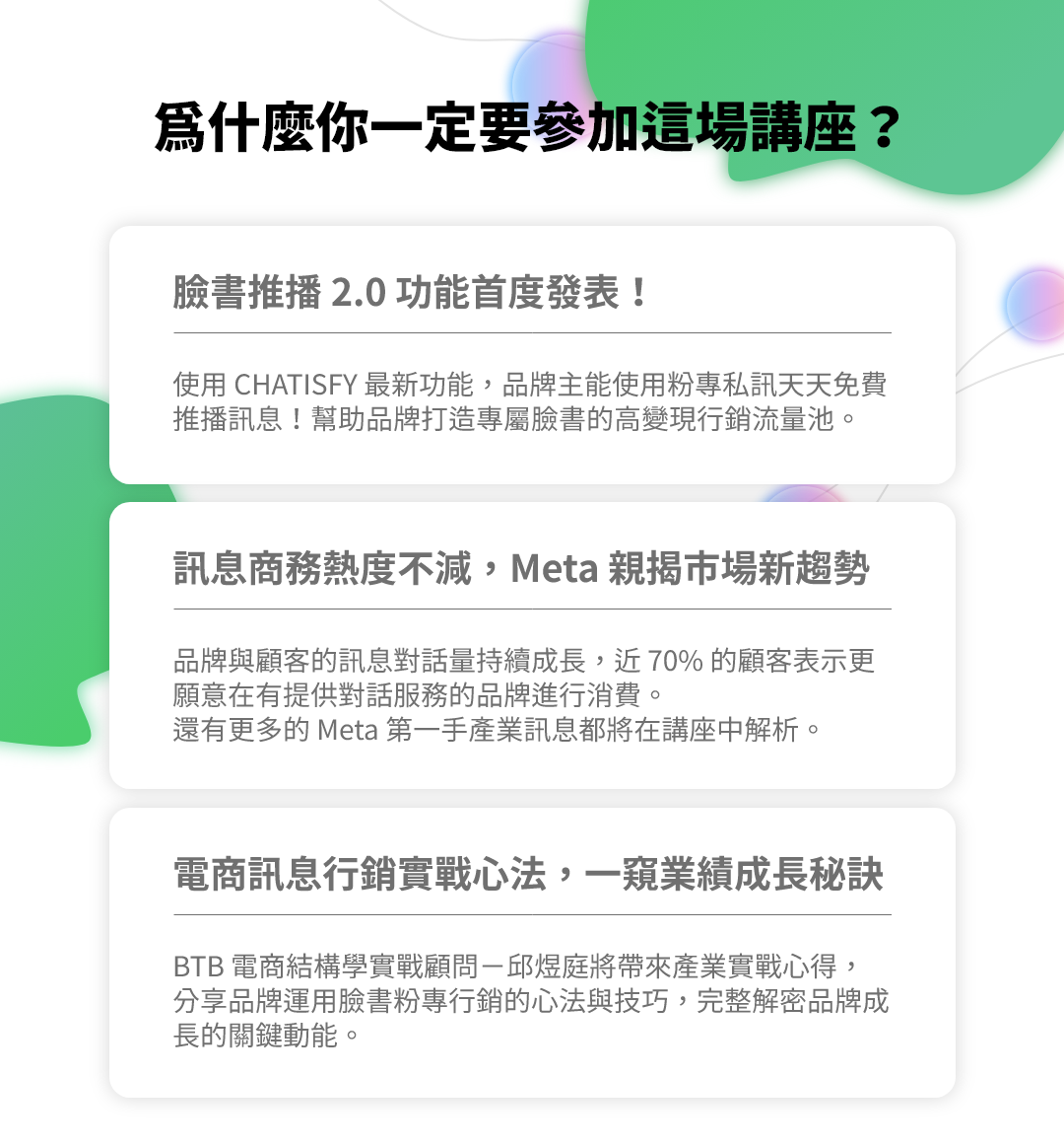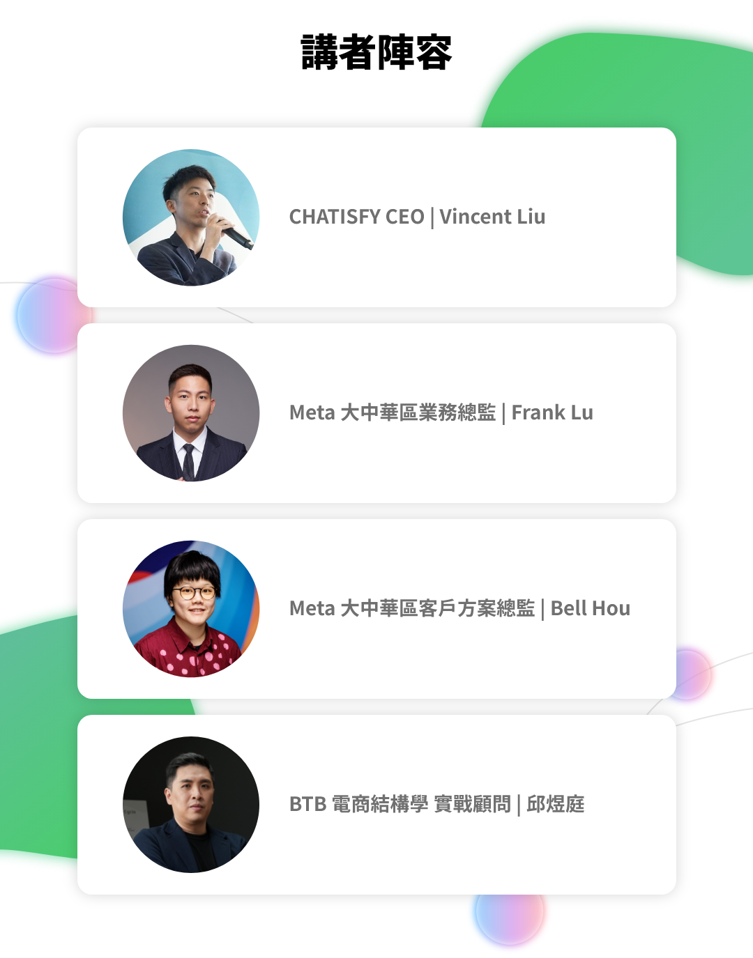 10/27 在 Meta 台灣辦公室,由科技巨頭 Meta 親自解析訊息式商務的市場新趨勢、CHATISFY CEO Vincent Liu 完整說明臉書推播訊息解決方案,並首度公開全新臉書推播功能「定期通知」的應用攻略。