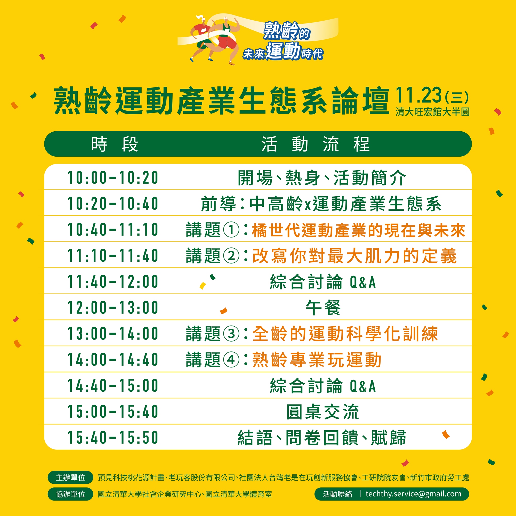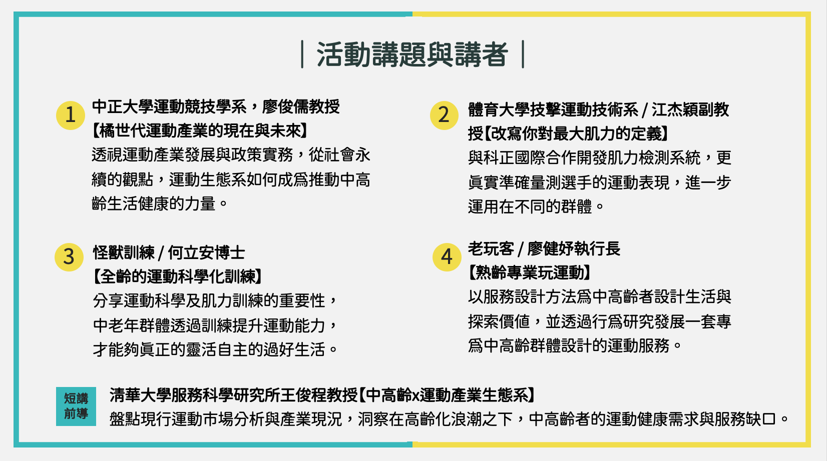 《熟齡的未來運動時代》第二場活動「熟齡運動產業生態系論壇」,團隊邀請從學理、研究到臨床的專家夥伴,分享關於中高齡運動的研究與實務成果,希望能聚集運動產業生態系的運動設備、賽事訓練、高齡科技等廠商企業,加以集思熟齡運動議題,共同來探討高齡社會的願景與運動服務創新。