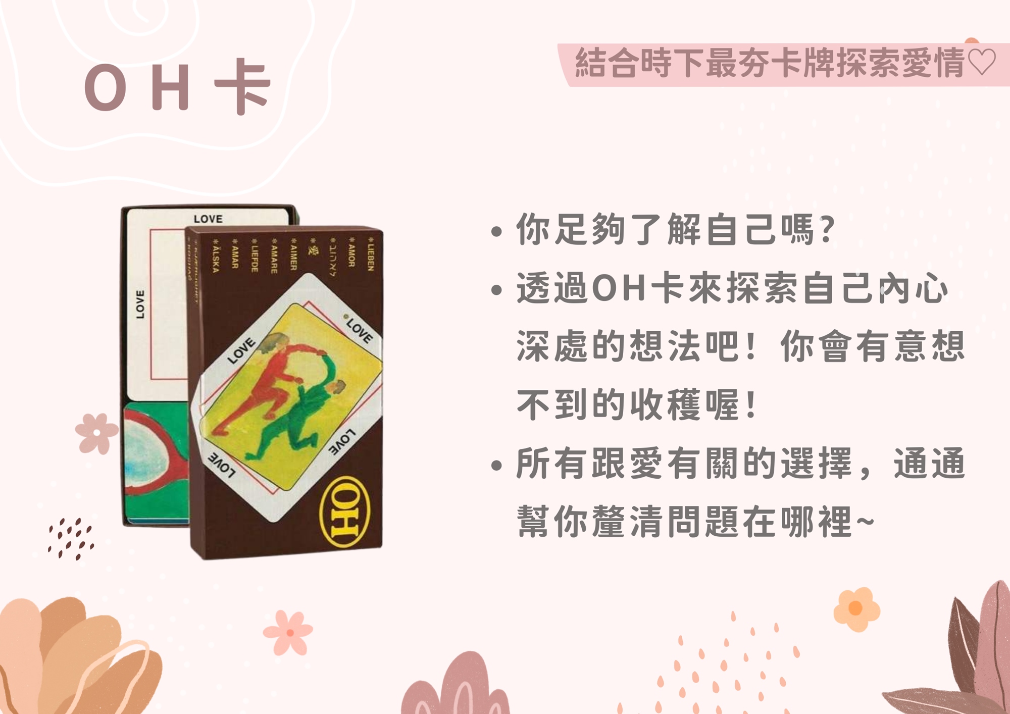 ※ OH卡:透過每一張圖像牌卡與文字卡的組合,解讀出您潛意識不同的想法,協助釐清您在意/想要的部分是什麼,而每個人的解讀不同,解答也就不一樣,等您一起來探索!!