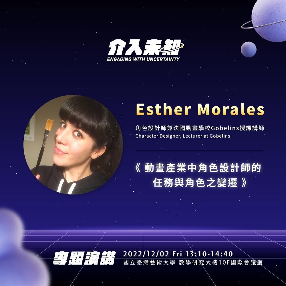 樂於與其他藝術家分享想法和創作過程的 Esther Morales,積極地在世界各地舉辦講座和大師班,以及在 Gobelins、l'école de l'image(法國巴黎)和 The Animation Workshop (丹麥維堡)擔任角色設計老師。