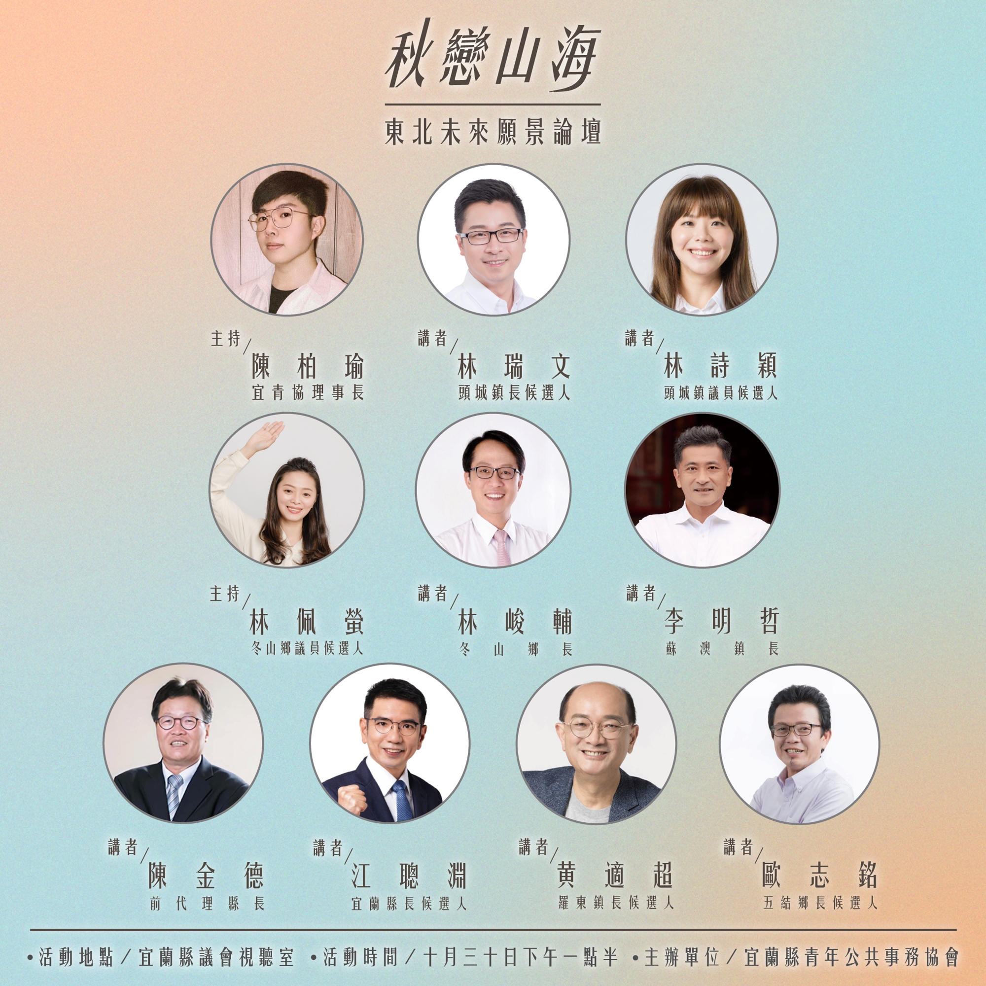 我們邀請到陳金德 前代理縣長、江聰淵 宜蘭縣長候選人、黃適超 羅東鎮長候選人、李明哲 鎮長、林峻輔 鄉長、歐志銘 五結鄉長候選人、林瑞文 頭城鎮長候選人、林詩穎 議員候選人、林佩螢 議員候選人,與我們一起對談,陣容堅強,若有興趣討論公共事務的朋友千萬別錯過!