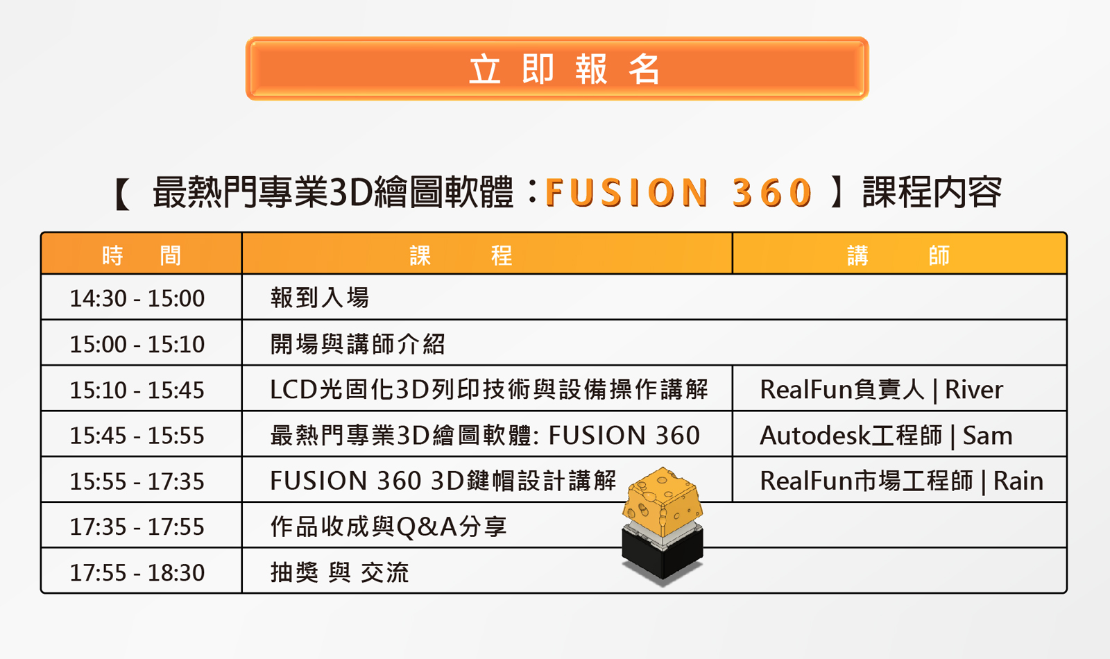 4 . 報名費:原價NT$6,000,限時福利"免費"!需先購買100元票券即可完成報名(此100元會於當日進場時退還)。同時,只要報名完成並至Real Fun 3D列印粉絲專頁打卡按讚,當日即可參加神秘小禮物抽獎