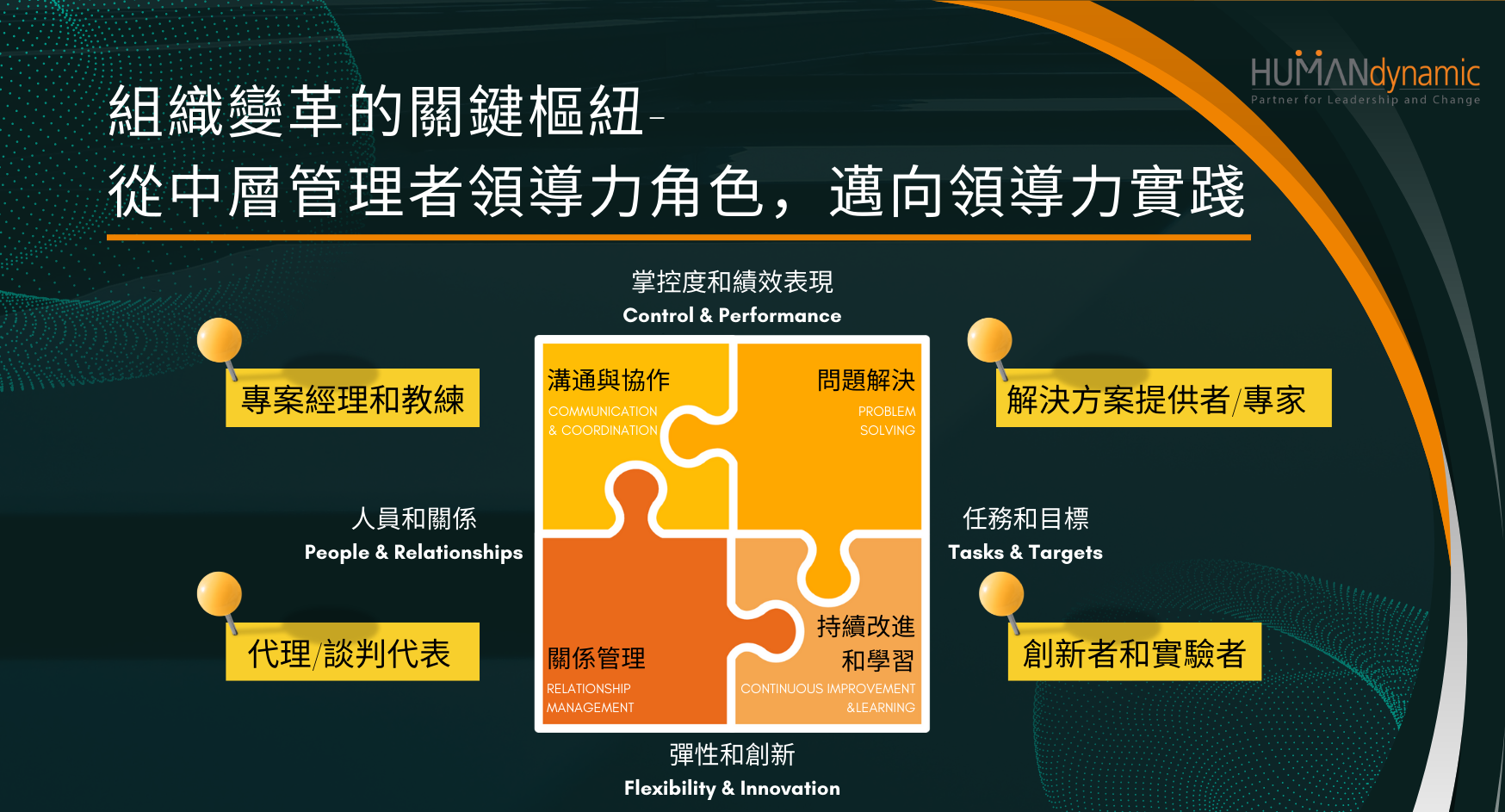 企業主 高階管理者 人資主管 | 作為重要領導者的您,如何幫助組織內的中層關鍵管理者發揮領導力與影響力。 由四個績效面向: 掌控和績效 (Control & Performance)、 彈性和創新 (Flexibility & Innovation)、 人員和關係 (People & Relationships)、 任務和目標 (Tasks & Targets) 實踐關鍵領導力,面對組織層面、團隊領導和個人層面的變革中,發揮領導變局的關鍵樞紐作用。 |