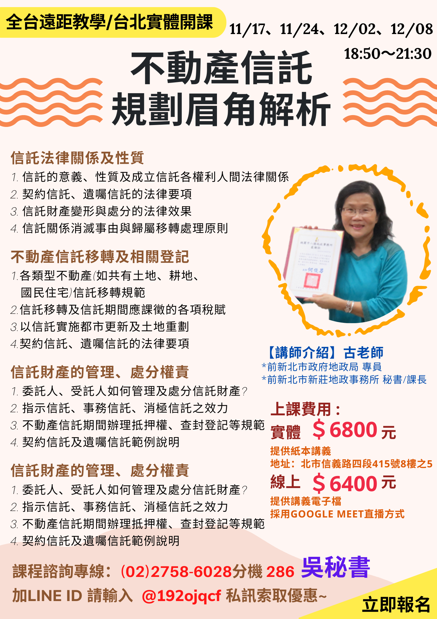 【全台遠距教學/線上錄影課程】11/17起 不動產信託規劃眉角分析,線上優惠價6400元