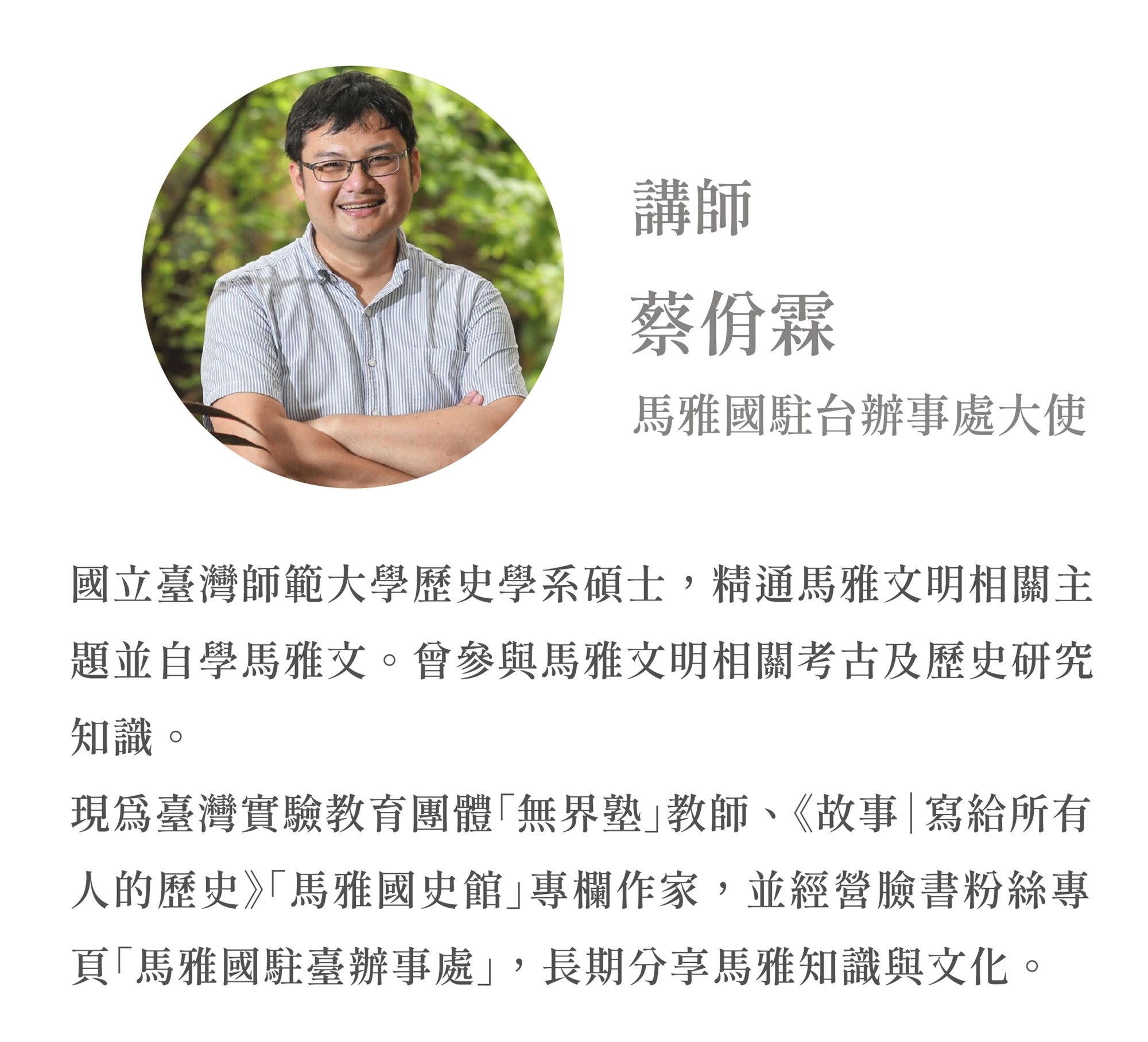 2017年,迪士尼以亡靈節為主題,製作熱門動畫《可可夜總會Coco》,若看過,必能哼唱幾句其中金曲,更被電影中的歡樂氣氛所渲染。今年亡靈節,就跟著馬雅國駐台辦事處大使-蔡佾霖 從電影《可可夜總會》出發,介紹亡靈節的儀式與信仰,他將與我們分享其中不可忽略的細節,聊中美洲各地如何歡慶亡靈節?更以其獨有的考古經驗出發,帶我們深入了解古老阿茲特克文明中的古老圖騰與引領亡靈、保護在世者的守護獸。