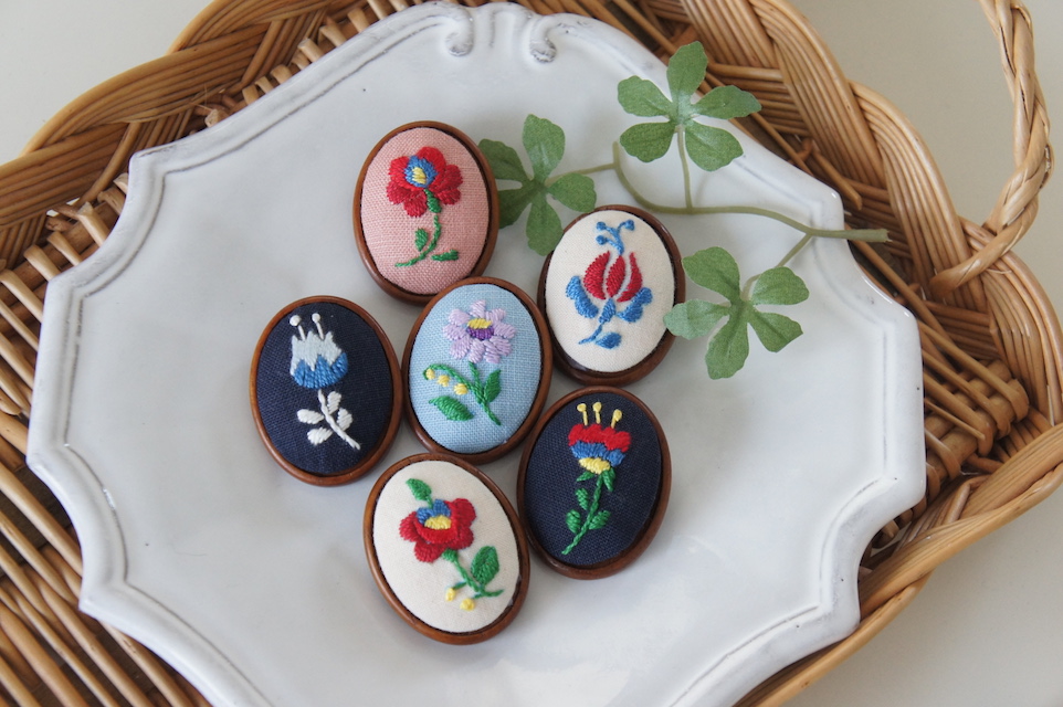 將圖案複製到布料上,簡單的用針線完成刺繡,並裝上木製胸針配件上,