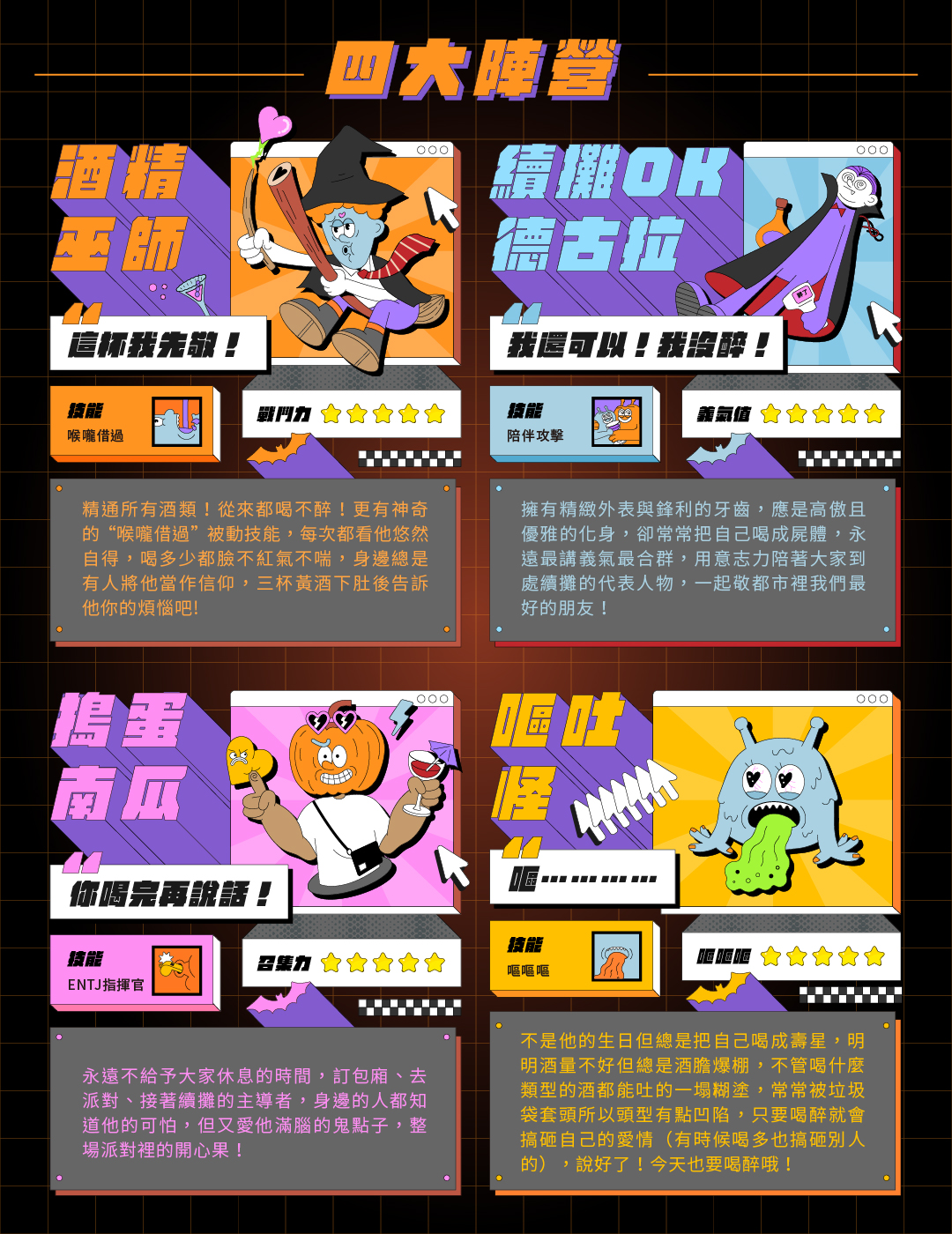 這次,Halfway Studio要帶你搭乘酒鬼巴士,享受醉心的旅程,推出三條路線,穿梭於酒吧及雙北兩座城市之間,沉浸在互動式光雕、場域香氣及美食與四大陣營遊戲任務所帶給你的五感體驗,帶給你最特別的萬聖之夜!