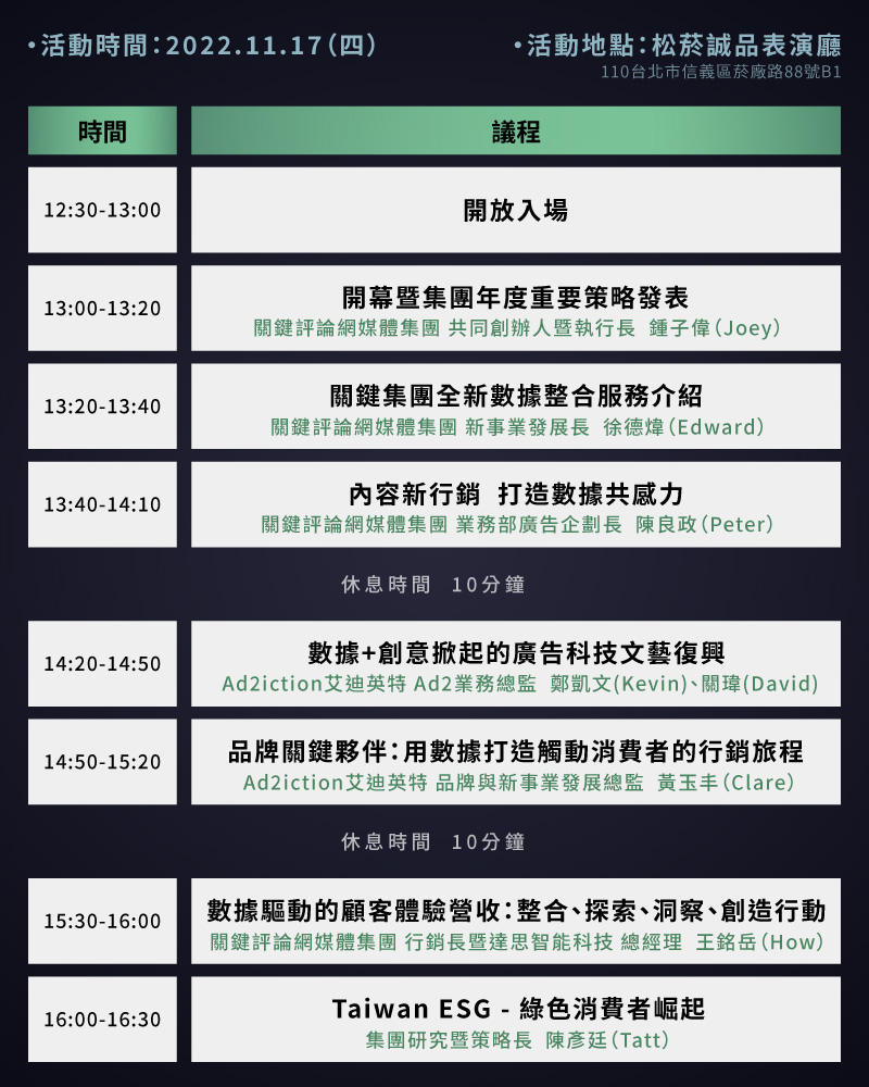 本次活動亮點將串連關鍵評論媒體體集團重點發展的產品與服務,您將可以了解冰冷的數據如何轉變成有溫度的內容,打造內容共感力,並與讀者建立信任的關係,從內容行銷結合第一方數據,看見消費意圖,精準曝光具創意的廣告版位,結合從零方的品牌顧客資料、一方的讀者閱覽資料、到三方的廣告互動資料,數據行銷顧問服務團隊如何與品牌夥伴譜寫動人的品牌故事與行銷旅程。