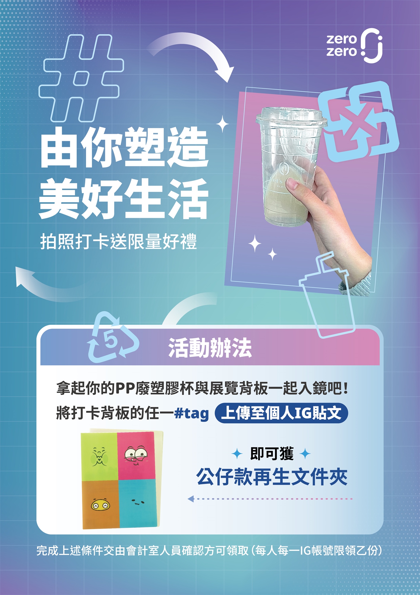 拍照免費禮>>展場拿取PP塑膠飲料杯與展場入鏡拍照者,TAG#回收GO環保 ,上傳個人IG貼文,由會計人員審核,即獲zero zero公仔款再生文件夾 (限量100份 送完為止)