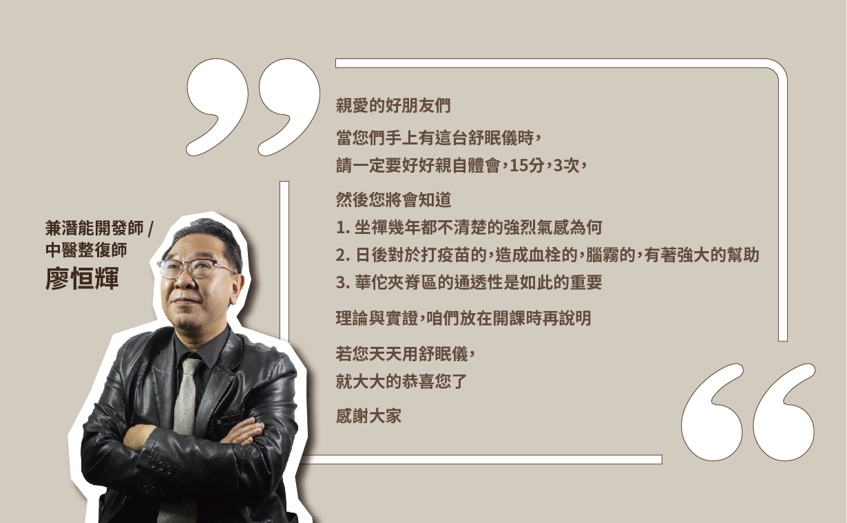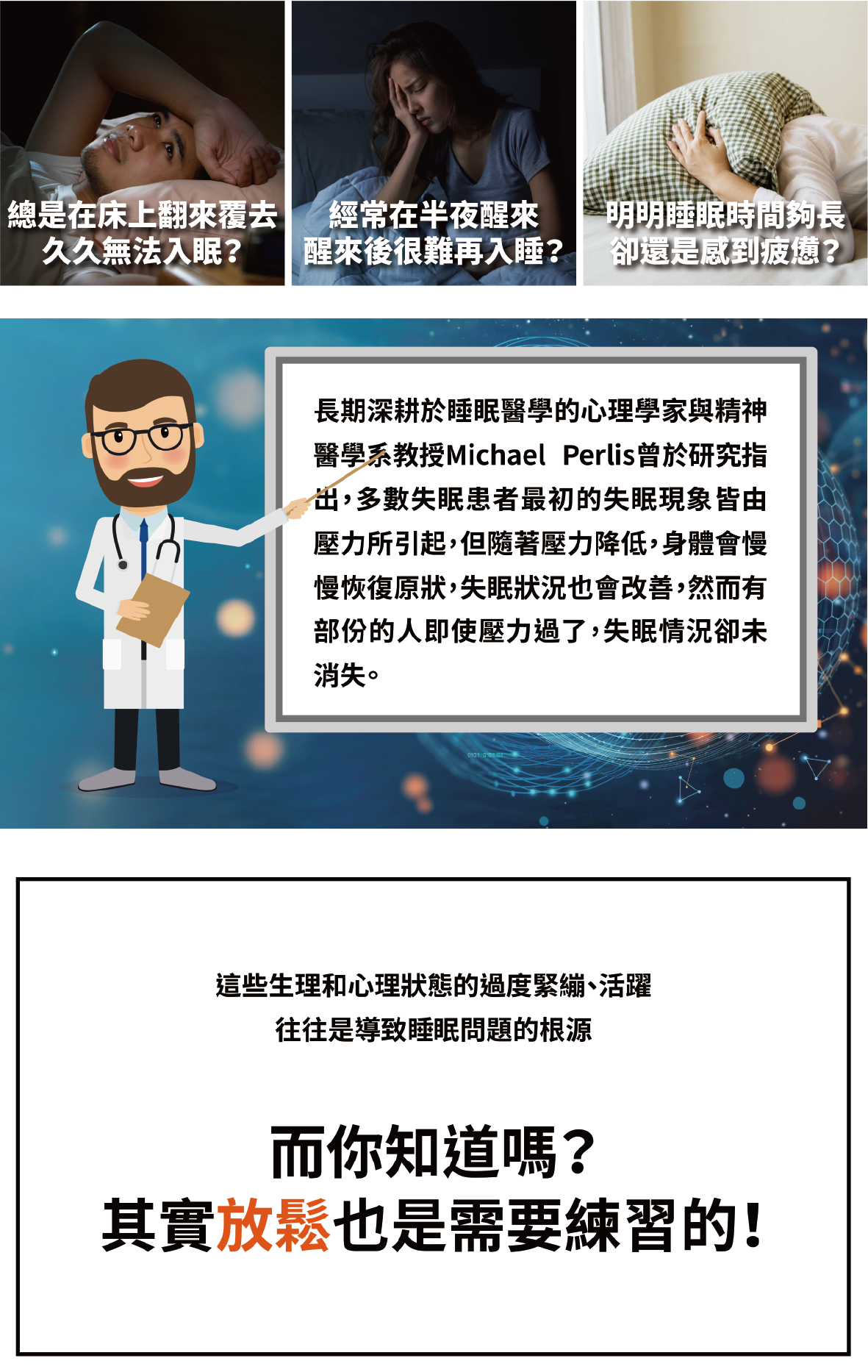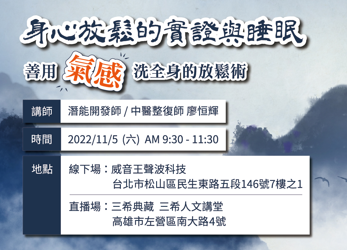 總是在床上翻來覆去,久久無法入眠?經常在半夜醒來,醒來後很難再入睡?這次我們邀請到身兼潛能開發師、中醫整復師與身心腦健康諮詢師的廖恒輝老師,為大家講解「身心放鬆」的核心觀念,從中醫氣血、整復、音聲療癒及六根六識的觀點,帶您了解人體由動入靜的運作原理,以及善用「氣感」放鬆身心的有效方法!如果您也有睡眠上的困擾,或是對「身心放鬆」議題感興趣,並相信「氣」的力量,歡迎參加本次課程,一同學習神奇的氣感放鬆術吧!