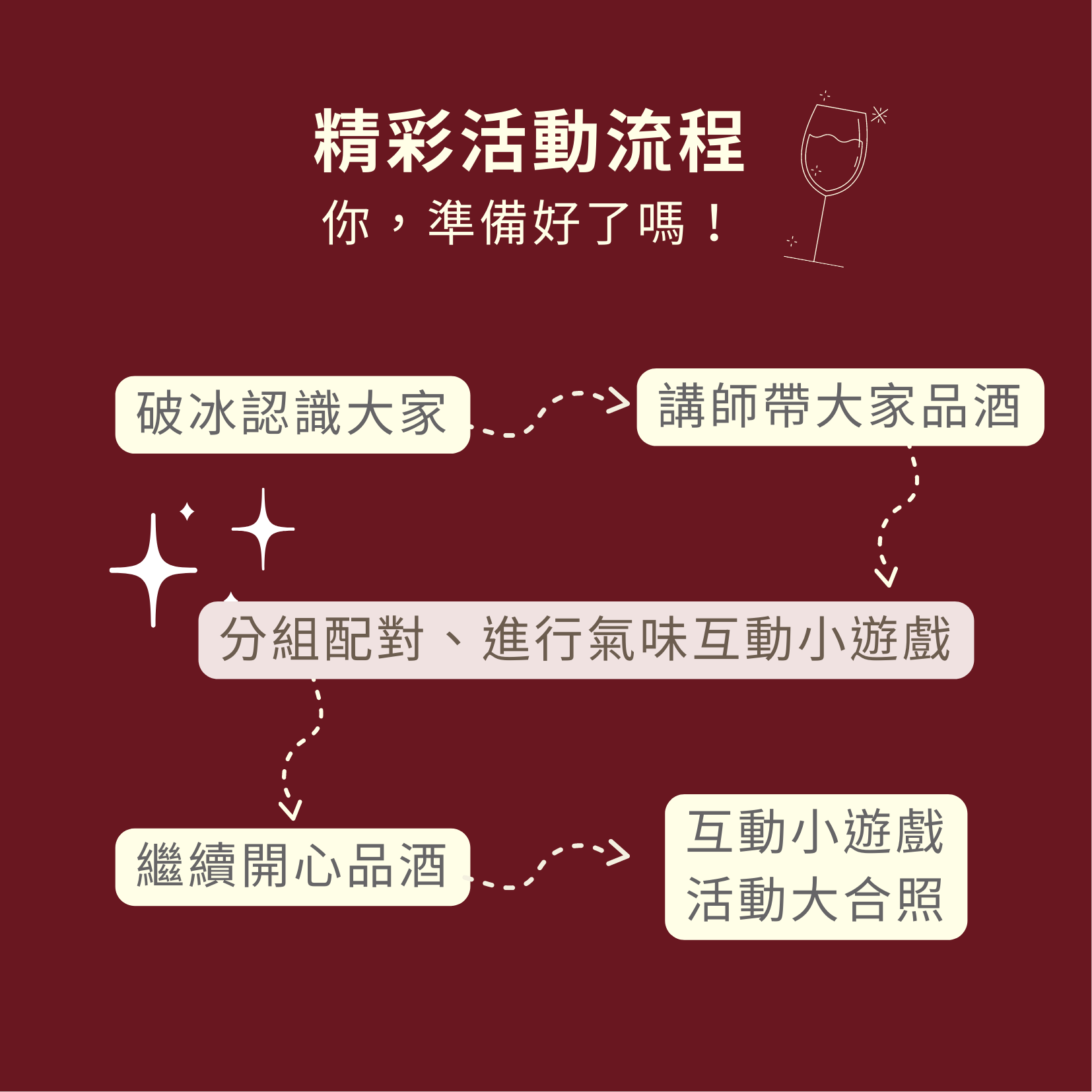 當天除了基本的破冰活動(待確定進行方式),在活動中間更會以兩兩分組的方式,讓大家能跟自己的partner一起體驗聞酒的趣味過程!活動尾聲時,也會安排自由交流的時間,讓大家在這時聊得痛快!