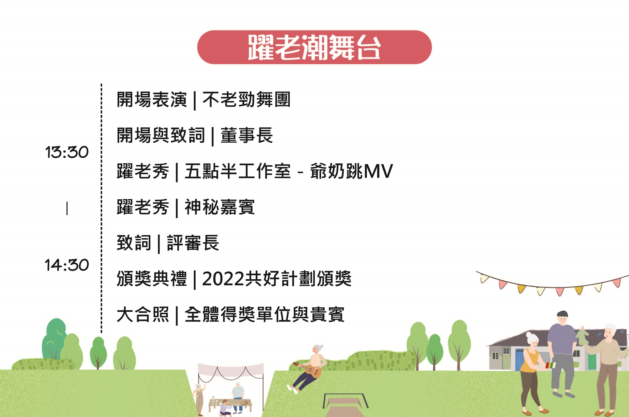 展現2021成果迎向未來~過去一年,從花蓮、宜蘭、台北、新北、桃園、苗栗、台南、高雄到金門、澎湖共14個單位,已完成他們的「共好行動」;並將在《躍老幸福市集》當天展現成果,再交棒給2022年度獲獎的14個單位,為即將展開下一年度的共好行動注入滿滿的活力。