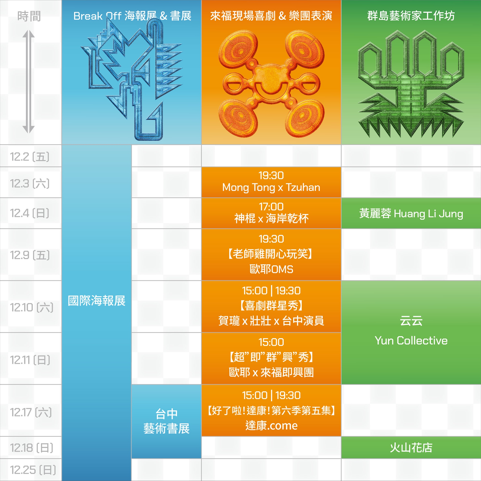 屬於台中、全新型態的寶石藝術節,12月2日至12月25日,每日有集結多國藝術家的國際海報展覽及藝術家工作坊,接著每週六日樂團表演、喜劇脫口秀、台中藝術書展等節目接力登場,每週每天都可以享受各式各樣的藝術活動。