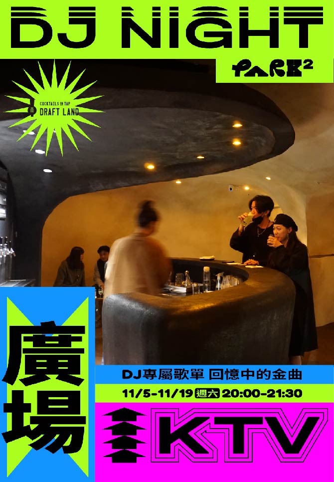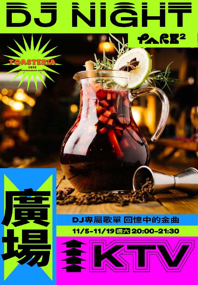 在年末前用力的感受華語魅力,沉靜在回憶中的歌曲中,音樂的充斥全身,露天場地更無限制的釋放能量,心的舞蹈因子也可以盡情搖擺。 PARK2 B1 廣場將於11月週六晚上將變身為 KTV 包廂,連續三週舉辦華語主題音樂派對,利用大人系公園的魔力,讓成年人把不快的回憶都能轉或成為經驗,開心度過每一天夜晚。