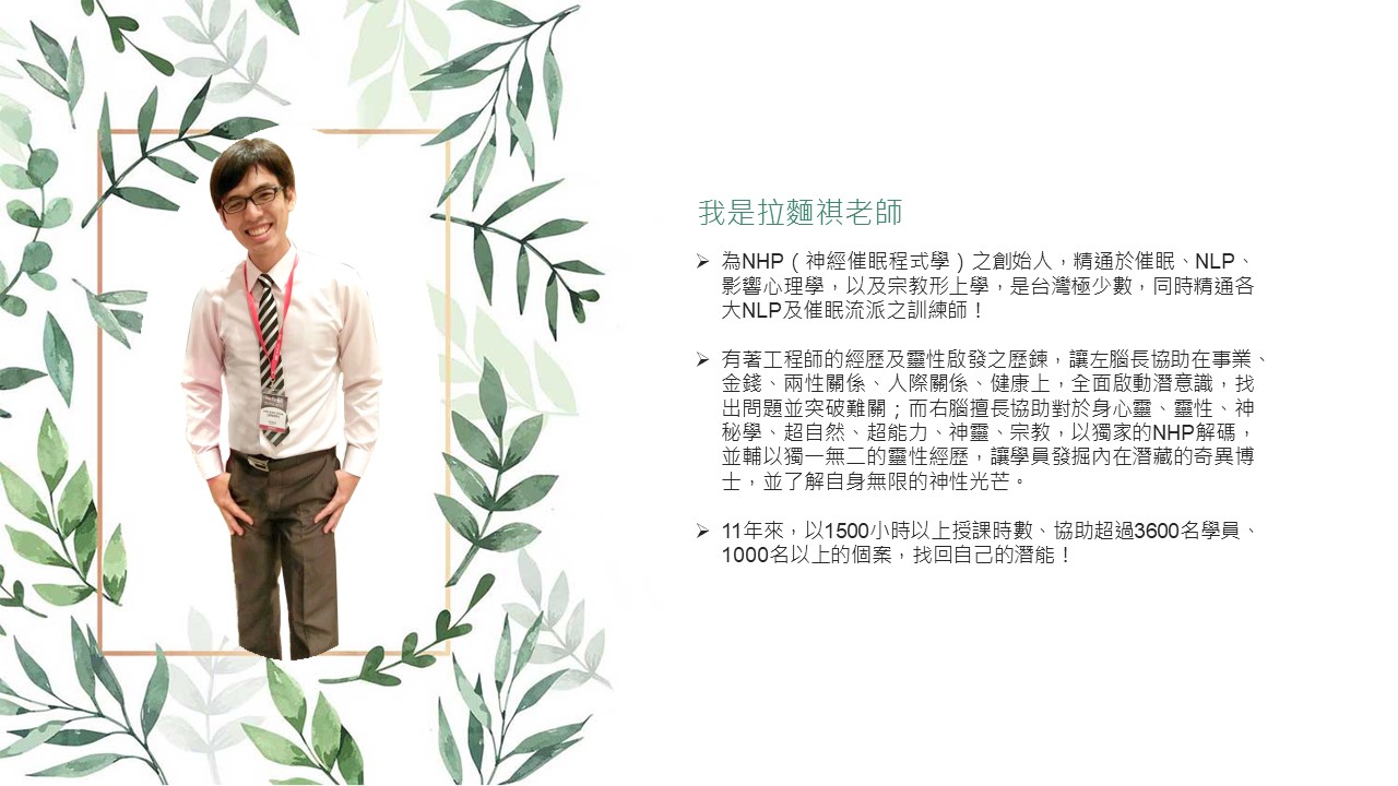 乃為NHP(神經催眠程式學)之創始人,精通於催眠、NLP、影響心理學,以及宗教形上學,是台灣極少數,同時精通各大NLP及催眠流派之訓練師! 曾受過多位NLP及催眠的權威、創始人的親自培訓及認證 例如John Grinder、Robert Dilts、Judith Delozier、Frank Pucelik、Tim Hallbom、Christina Hall、安東尼羅賓、加藤聖龍、Jeffrey K.zeig、Stephen Gilligan、Bill O'Hanlon、Tamara Andreas...等等 因其工程師的經歷及靈性啟發之歷鍊,其左腦擅長協助在事業、金錢、兩性關係、人際關係、健康上有各著疑難雜症之客戶,使其全面啟動潛意識,找出問題並突破難關; 而右腦擅長協助對於身心靈、靈性、神秘學、超自然、超能力、神靈、形而上及宗教有著無限好奇之學員,以獨家的NHP解碼,並輔以獨一無二的靈性經歷,讓學員發掘內在潛藏的奇異博士,並了解自身無限的神性光芒。 11年來,以1500小時以上授課時數、協助超過3600名學員、1000名以上的個案,找回自己的潛能!