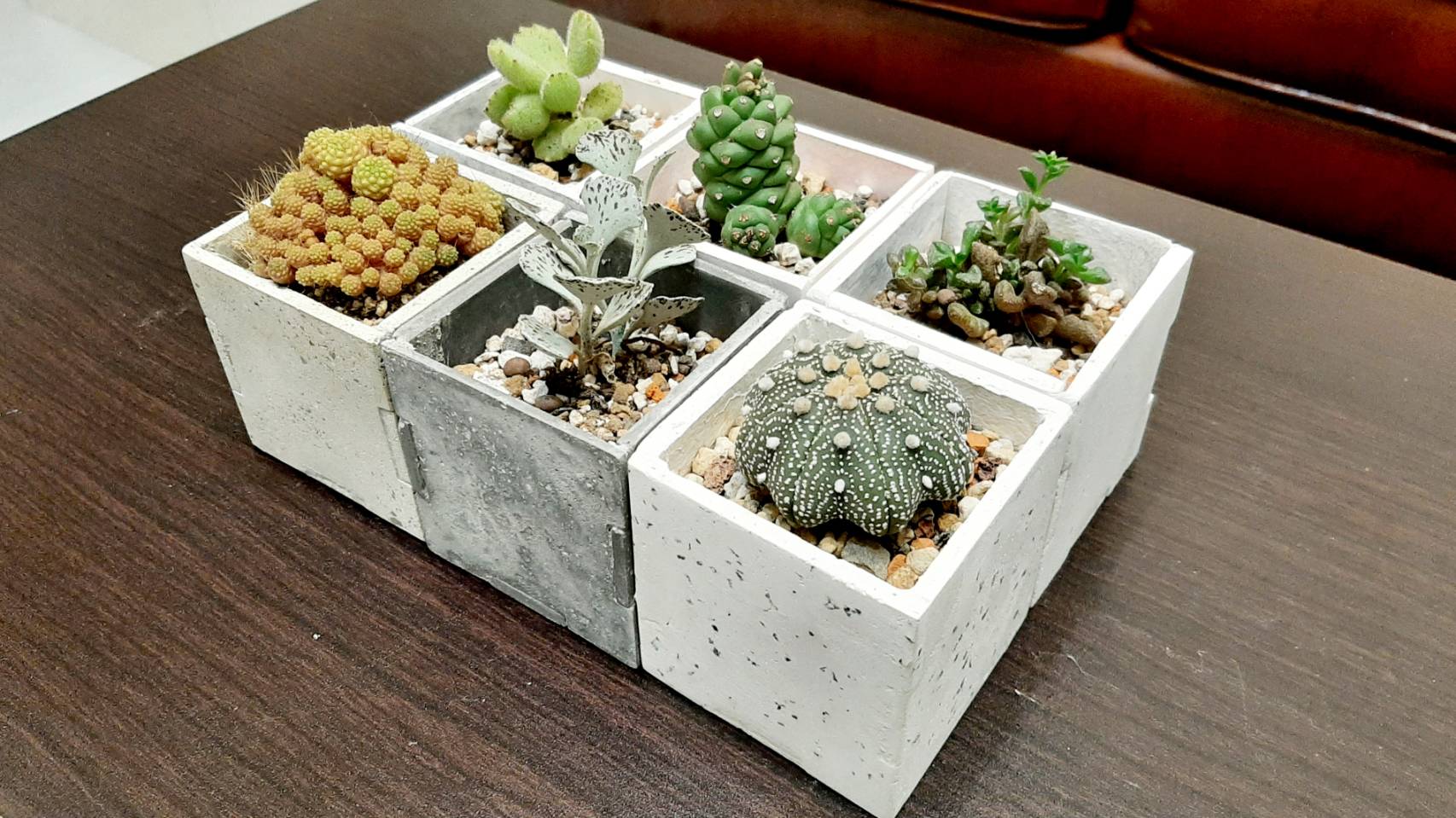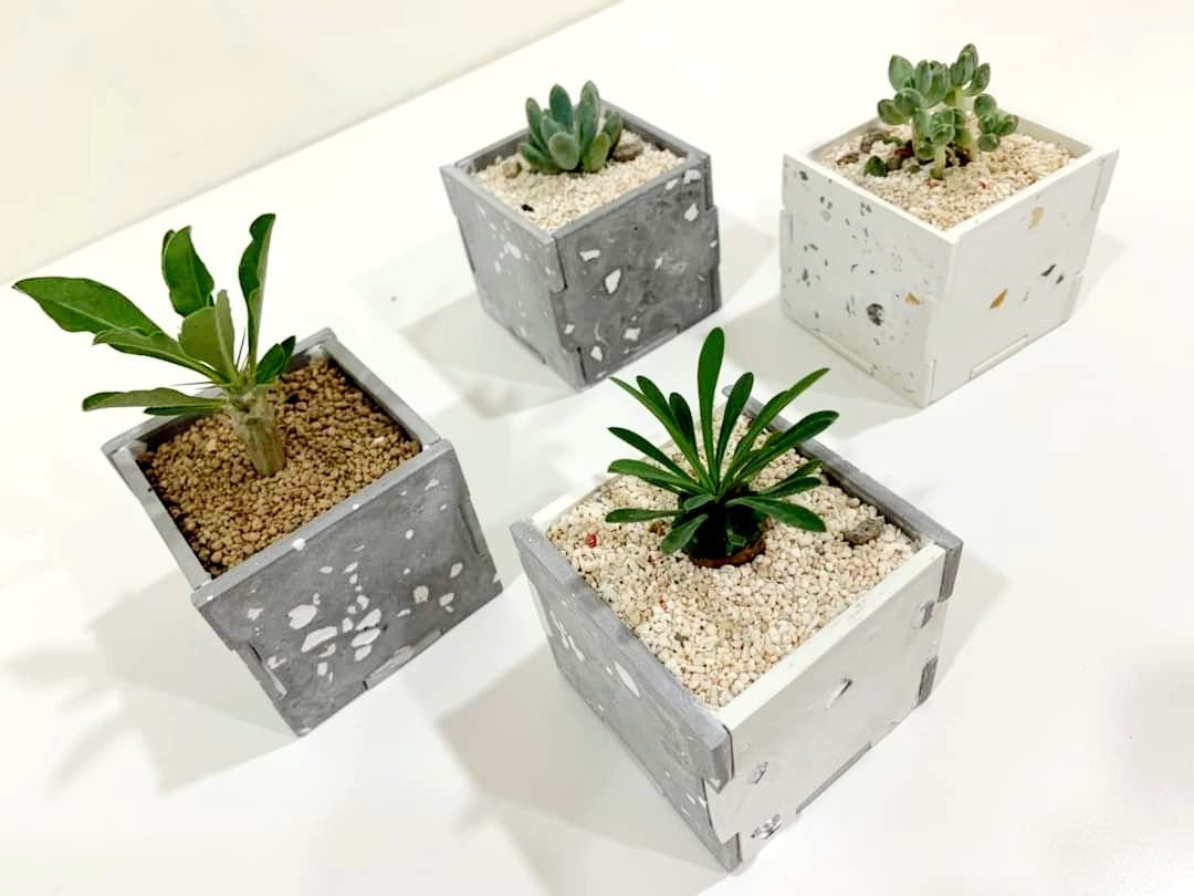 在講師的帶領下,現場示範將撿拾回來的廢棄水泥、碎石磨碎,接著按照比例混合水泥粉、水以及小碎石翻模進行翻模,接著運用五片拼板組合出一個6*6公分的方形水泥盆器。學會可以利用這些水泥拼板透過打磨讓表面變得平整,組裝成為屬於自己獨一無二的盆器!