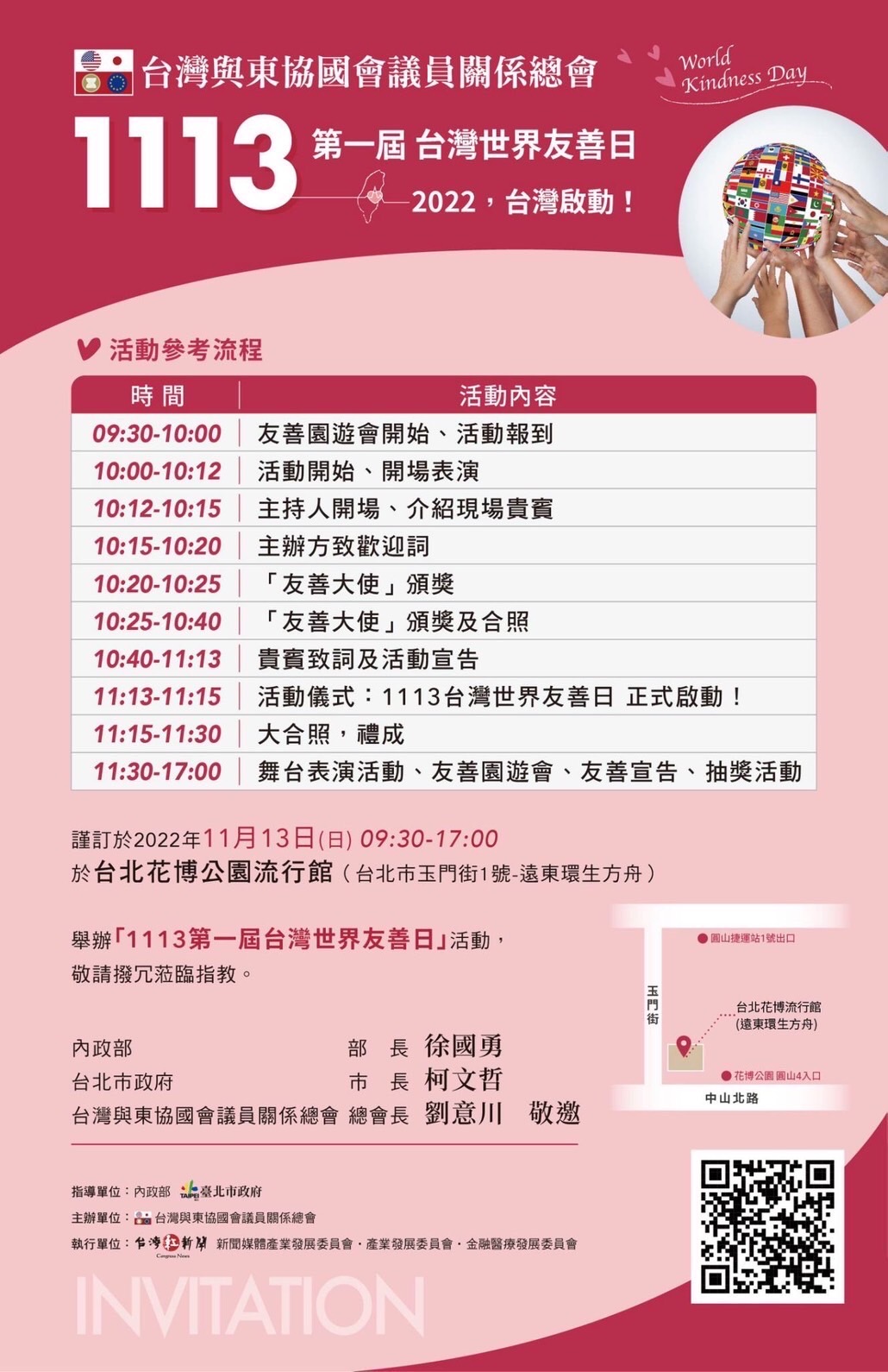 「台灣與東協國會議員關係總會」特別舉辦「1113第一屆台灣世界友善日,2022 ,台灣啟動!」活動,宣告「世界友善日」在台灣正式啟動,呼籲大家一起動起來!希望藉由活動的推廣,讓共同生活在台灣寶島這塊土地的人們,跨越一切限制,彼此釋出善意,從友善自己,進而友善他人、友善城市、友善環境、友善地球,處處散發友善正能量。