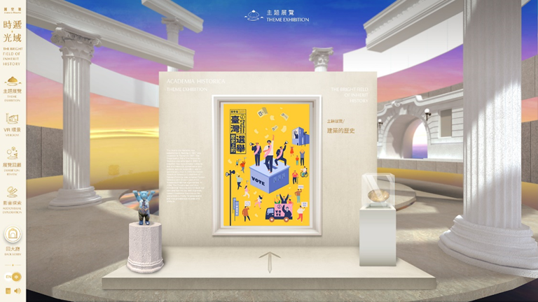 於此大平臺中,主要推出「主題展覽、VR環景展間、展覽回顧、影音探索」四大服務項目;而「主題展廳」則與館內線下展出的當期展覽同步,讓無法到館參觀的民眾,亦可透過大平臺一飽眼福,而現正展出的則有「臺灣歷史上的選舉」、「動物禮讚-總統副總統文物展」及「建築的歷史」三檔展覽。首先,「臺灣歷史上的選舉」主要探討自1935年臺灣歷史上 第一場選舉開始至2008年第二次政黨輪替,跨越70年以上人民爭取參政權的歷程與重大案件,這些過程與其說是選舉制度的轉變,不如說是人民追尋民主與自 由的歷程。其次,「動物禮讚-總統副總統文物展」精選總統副總統文物中以動物形象為主題的禮品,分為「國徽‧國鳥」、「神話傳說」、「常民生活」及「生態保育」四個單元,作議題式的展出與闡述禮品背後蘊含的意義。最後,「建築的歷史」則是以國史館本身的主體建築為要角,在建築經歷不同階段的使用需求而改變樣貌的情況下,從建物的歷史及美學面切入介紹,一方面藉現地將古蹟風采再度展陳於觀眾面前,重新認識館體建築的價值,並重視文化資產保存。