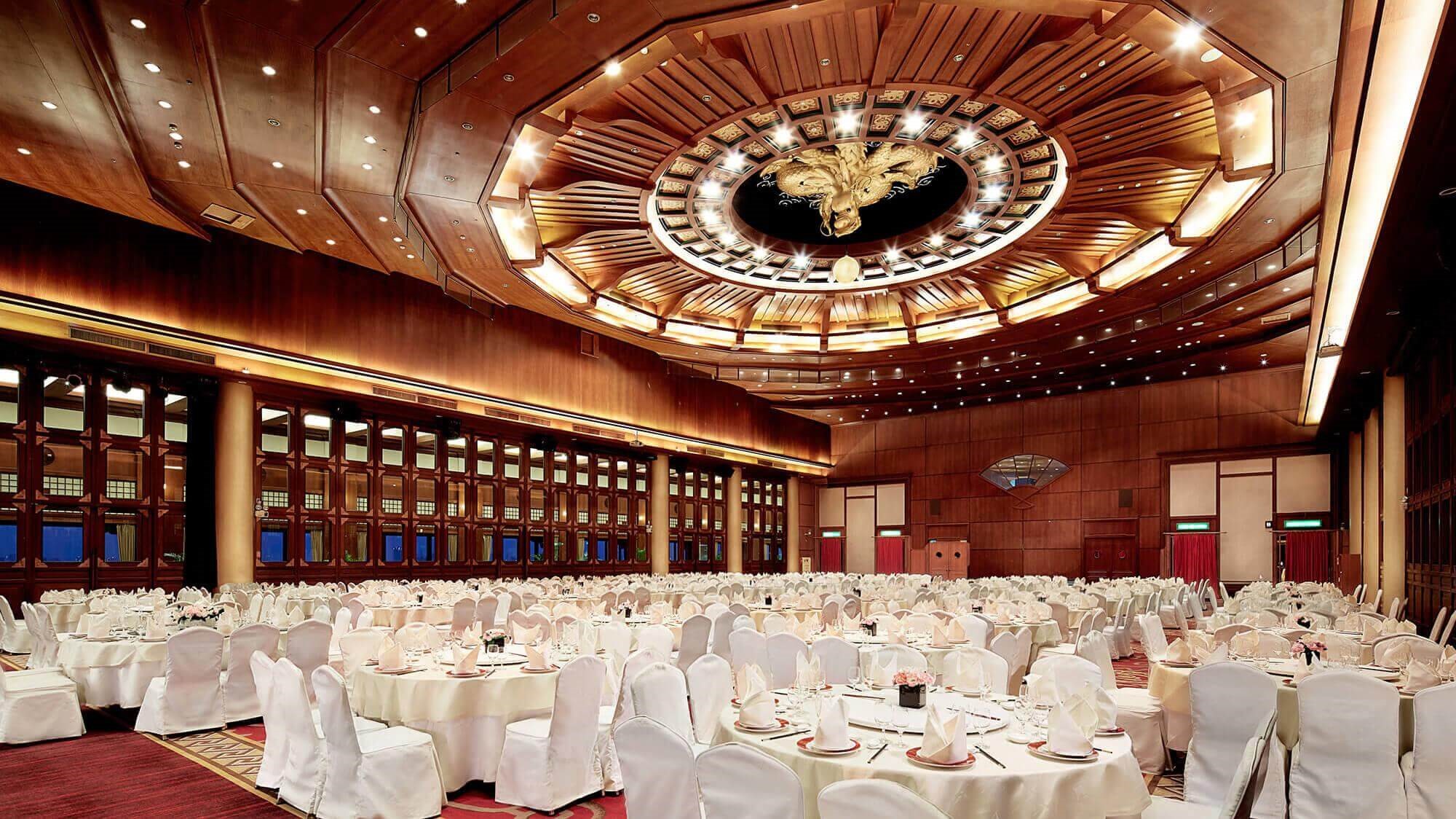 大會廳體現出中國皇室的威嚴與氣派,挑高高達11公尺高的壯闊氣勢,雕樑畫棟、飛簷斗拱的氣派非凡的擎天廊柱,天花板有著盤旋在天空的金龍,並且嘴中吐珠的巨作,更增添整場宴會圓滿祥瑞氣象。大會廳的磅礡氣勢,與本次論壇國際級格局,以及新時空醫學型態的呈現相得益彰。
