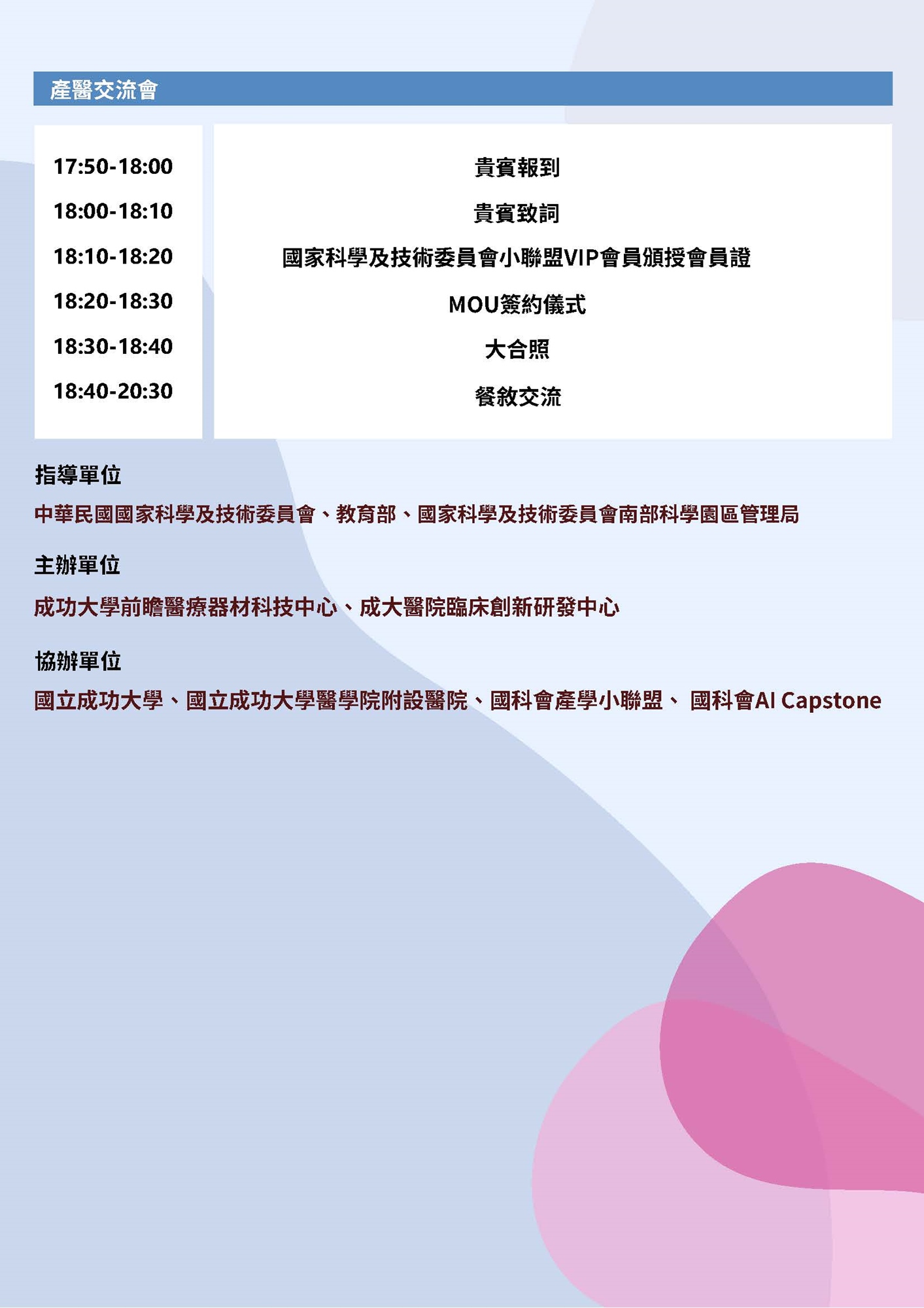 ◆ 產學醫交流會為邀請制,限聯盟會員與邀請貴賓。 非邀請貴賓收費5000 元/人。